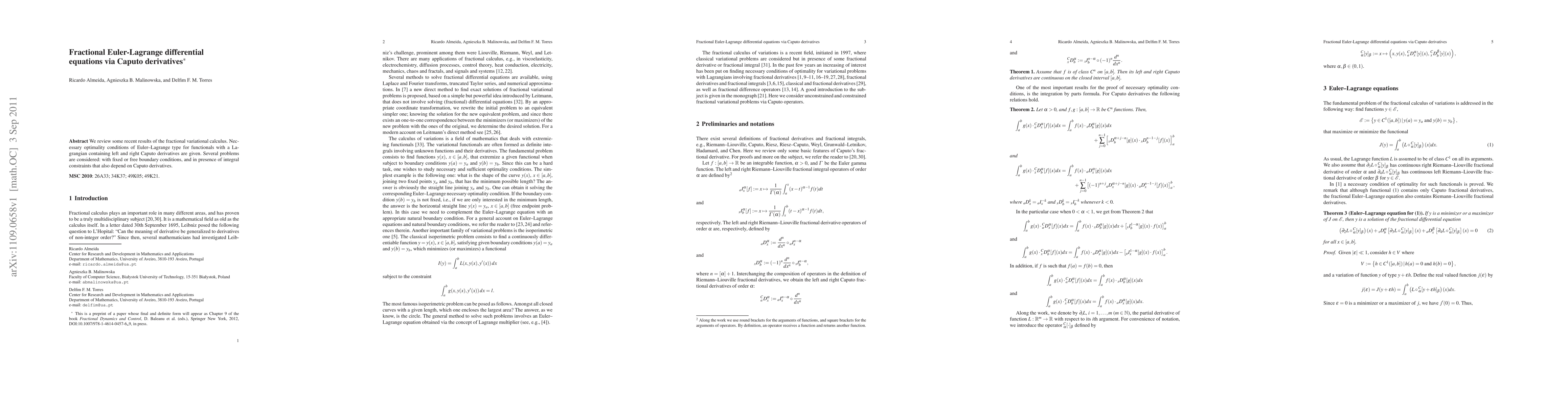 This paper reviews recent advancements in fractional variational calculus, presenting Euler-Lagrange conditions for fractional differential equations involving left and right Caputo derivatives. It addresses optimization problems with various boundary conditions and integral constraints dependent on Caputo derivatives.