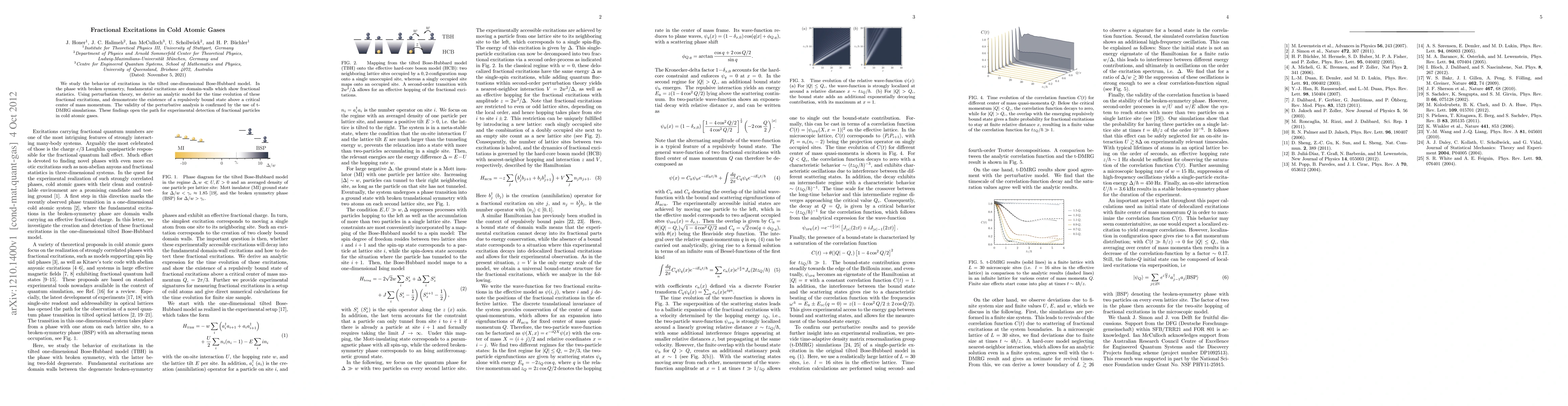 The paper presents a perturbative analysis and t-DMRG simulations to model and analyze fractional excitations in a meta-stable state of the tilted one-dimensional Bose-Hubbard model, revealing a repulsively bound state of domain-wall excitations.