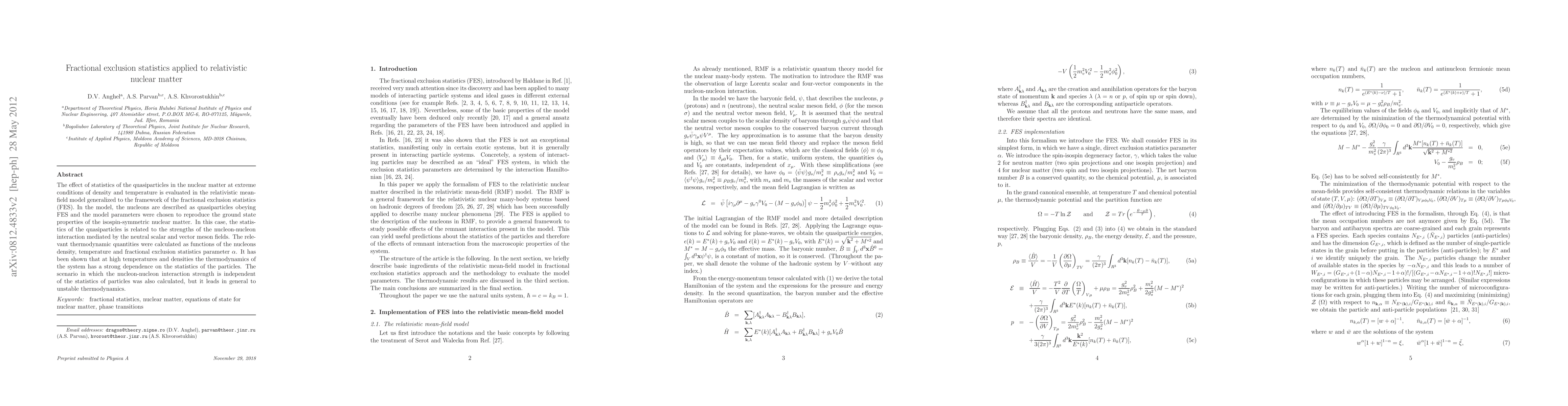 The paper evaluates the impact of fractional exclusion statistics on the thermodynamics of relativistic nuclear matter, finding strong dependence on particle statistics at high densities and temperatures, while a scenario independent of statistics generally results in unstable thermodynamic behavior.