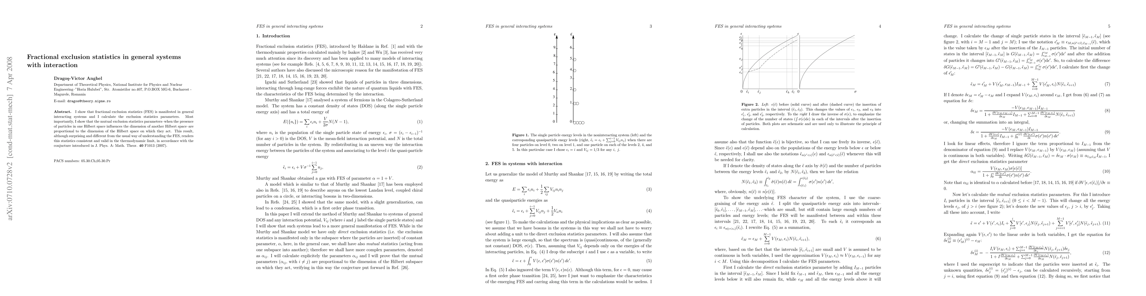 This paper demonstrates that fractional exclusion statistics (FES) emerge in general interacting systems and calculates the exclusion statistics parameters. It reveals that the mutual exclusion statistics parameters are proportional to the dimension of the Hilbert space they act upon, validating FES in the thermodynamic limit.