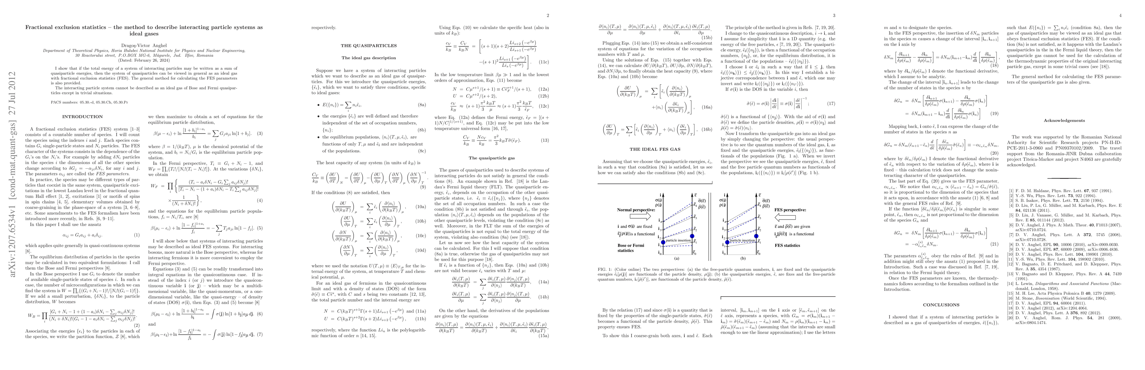 Summary: This paper introduces fractional exclusion statistics (FES) to describe interacting particle systems as ideal gases, providing a method to calculate FES parameters when quasiparticle energies sum the total energy. It highlights that such systems cannot be treated as ideal gases of standard Bose or Fermi quasiparticles except in simple cases.