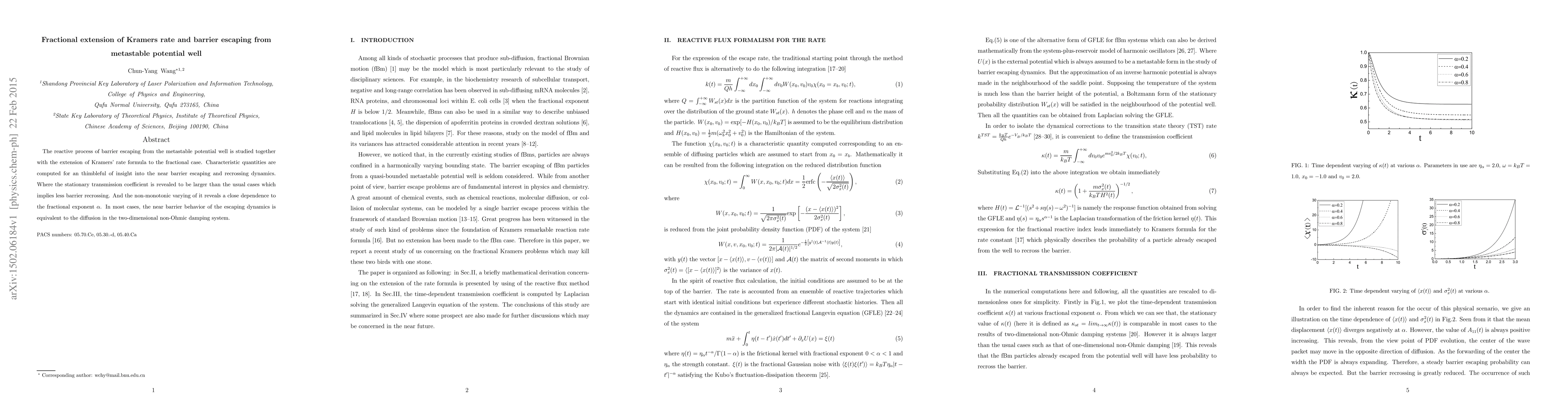 This paper extends Kramers' rate formula to fractional dynamics, analyzing barrier escaping from metastable potential wells. It finds that the stationary transmission coefficient is higher than in standard cases, indicating reduced barrier recrossing, with its non-monotonic behavior dependent on the fractional exponent $\alpha$.