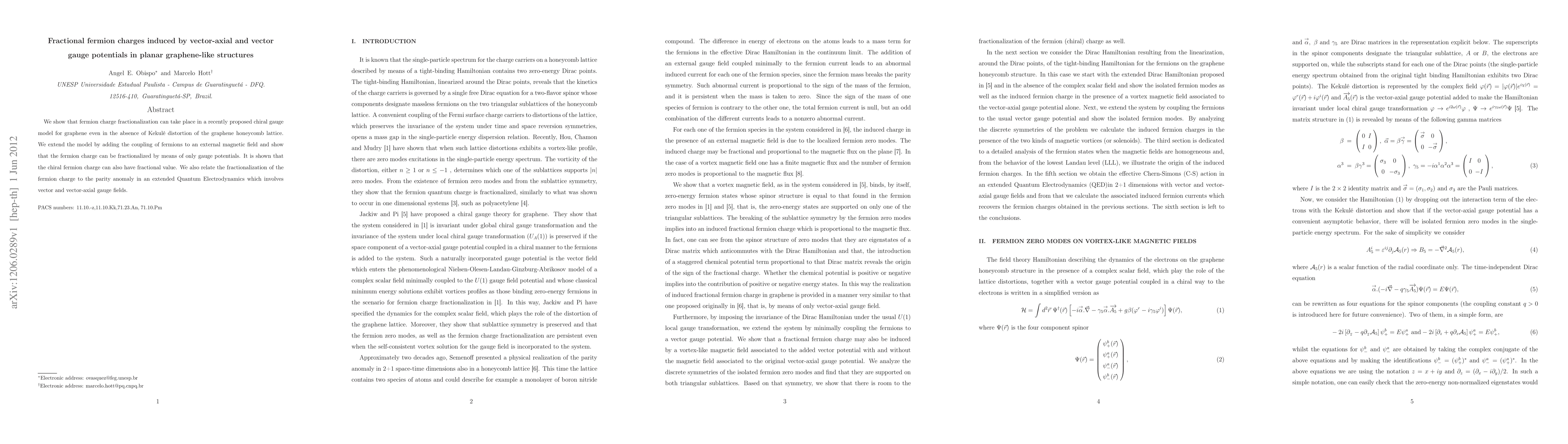 The paper demonstrates that fractional fermion charges can occur in graphene-like structures through chiral gauge models, even without Kekulé distortion. This is achieved using gauge potentials and magnetic fields, linking the phenomenon to parity anomaly in extended Quantum Electrodynamics.