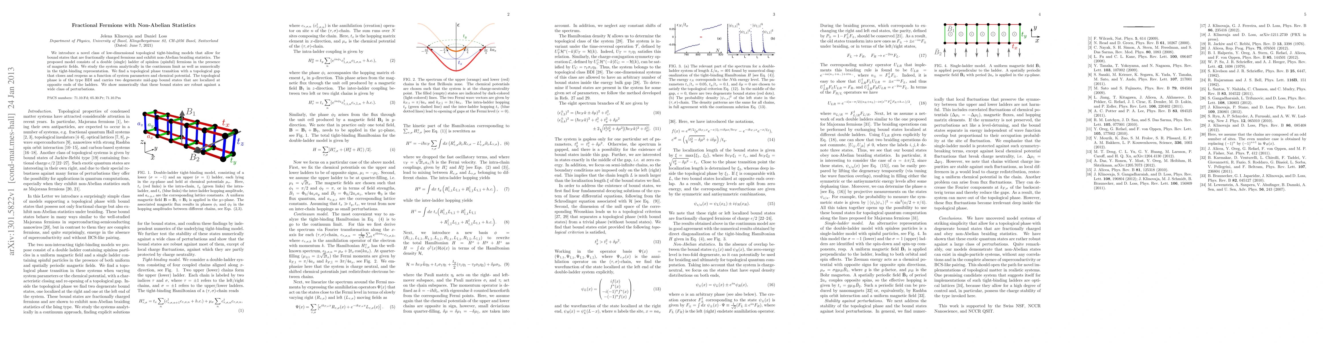 We introduce a novel class of low-dimensional topological tight-binding models that allow for bound states that are fractionally charged fermions and exhibit non-Abelian braiding statistics. The proposed model consists of a double (single) ladder of spinless (spinful) fermions in the presence of magnetic fields. We study the system analytically in the continuum limit as well as numerically in the tight-binding representation. We find a topological phase transition with a topological gap that closes and reopens as a function of system parameters and chemical potential. The topological phase is of the type BDI and carries two degenerate mid-gap bound states that are localized at opposite ends of the ladders. We show numerically that these bound states are robust against a wide class of perturbations.