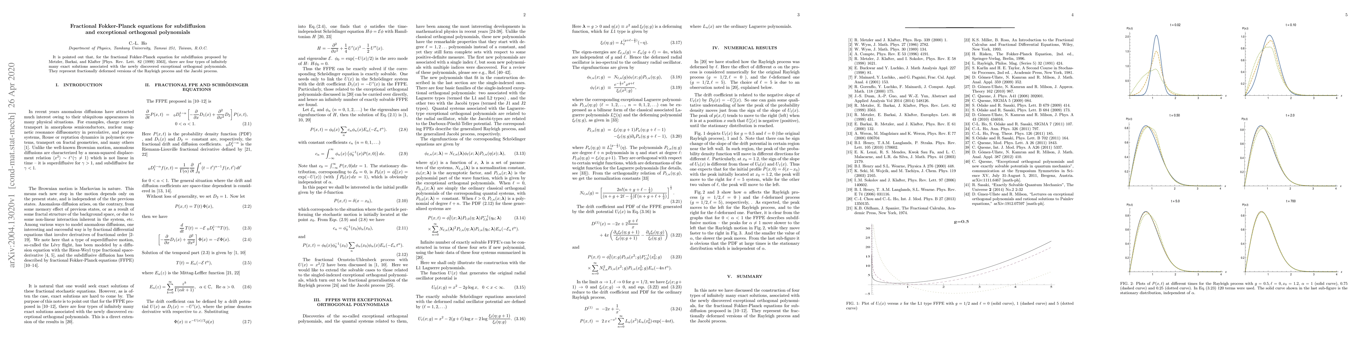 This paper identifies four types of exact solutions to the fractional Fokker-Planck equation for subdiffusion, linked to newly discovered exceptional orthogonal polynomials, representing deformed versions of the Rayleigh and Jacobi processes.