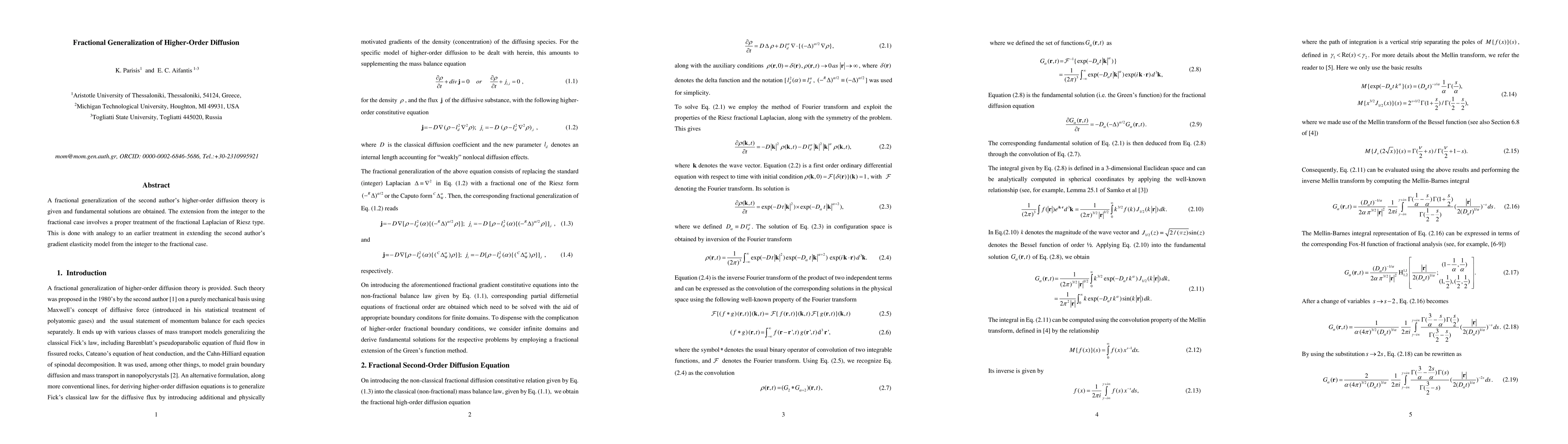 This paper generalizes higher-order diffusion theory to a fractional form, deriving fundamental solutions through the fractional Laplacian of Riesz type. The approach mirrors previous extensions of gradient elasticity models, emphasizing the transition from integer to fractional order.