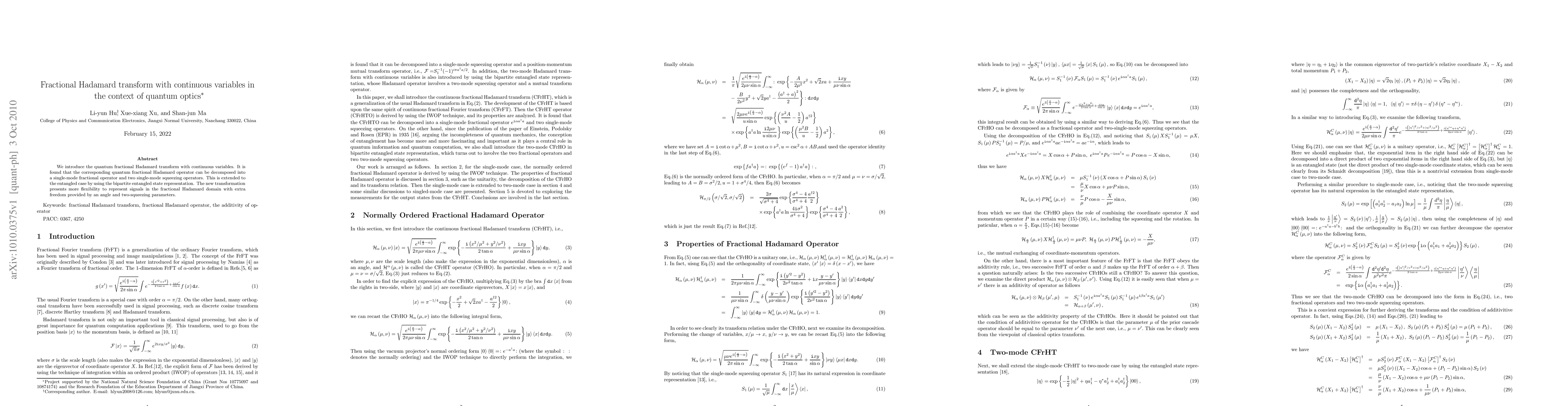 The paper introduces a quantum fractional Hadamard transform for continuous variables in quantum optics, showing it can be decomposed into a fractional operator and squeezing operations, with additional flexibility provided by an angle and squeezing parameters. This transformation is extended to entangled states using bipartite entangled state representations.