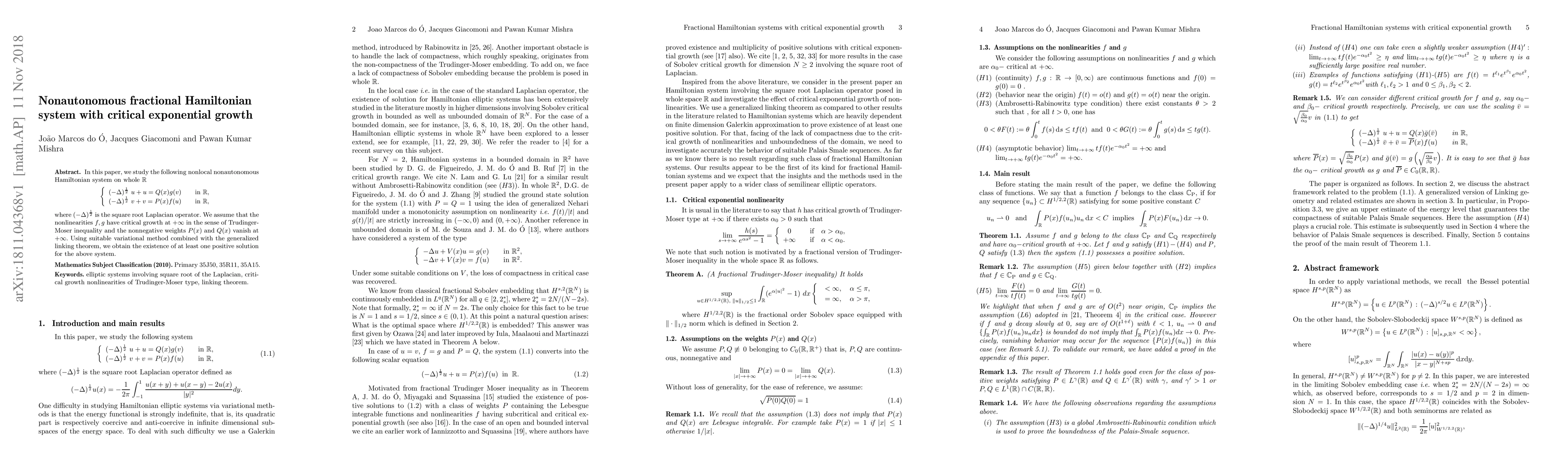 In this paper, we study the following nonlocal nonautonomous Hamiltonian system on whole $\mathbb R$ $$ \left\{\begin{array}{ll} (-\Delta)^\frac12~ u +u=Q(x) g(v)&\quad\mbox{in } \mathbb R,\\ (-\Delta)^\frac12~ v+v = P(x)f(u)&\quad\mbox{in } \mathbb R, \end{array}\right. $$ where $(-\Delta)^\frac12$ is {the} square root Laplacian operator. We assume that the nonlinearities $f, g$ have critical growth at $+\infty$ in the sense of Trudinger-Moser inequality and the nonnegative weights $P(x)$ and $Q(x)$ vanish at $+\infty$. Using suitable variational method combined with {the} generalized linking theorem, we obtain the existence of {at least one} positive solution for the above system.