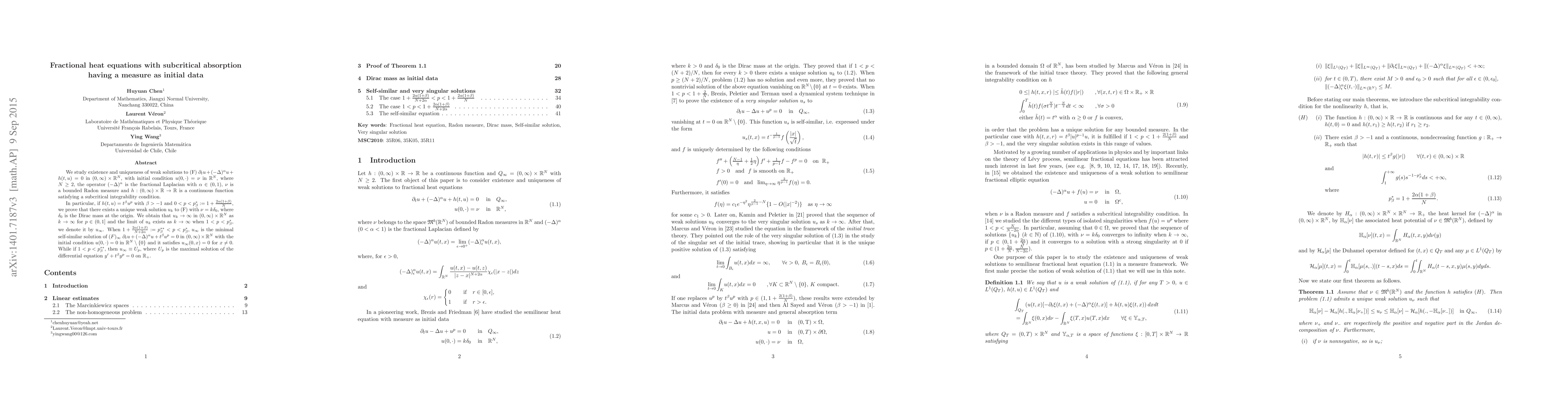 We study existence and uniqueness of weak solutions to (F) $\partial\_t u+ (-\Delta)^\alphau+h(t, u)=0 $ in $(0,\infty)\times\R^N$,with initial condition $u(0,\cdot)=\nu$ in $\R^N$, where $N\ge2$, the operator $(-\Delta)^\alpha$is the fractional Laplacian with $\alpha\in(0,1)$, $\nu$ isa bounded Radon measure and $h:(0,\infty)\times\R\to\R$ is a continuous function satisfying a subcritical integrability condition.In particular, if $h(t,u)=t^\beta u^p$ with $\beta\textgreater{}-1$ and $0 \textless{} p \textless{} p^*\_\beta:=1+\frac{2\alpha(1+\beta)}{N}$, we prove that there exists a unique weak solution $u\_k$ to (F) with $\nu=k\delta\_0$, where $\delta\_0$ is the Dirac mass at the origin. We obtain that $u\_k\to\infty$ in $(0,\infty)\times\R^N$ as $k\to\infty$ for $p\in(0,1]$ and the limit of $u\_k$ exists as $k\to\infty$ when $1 \textless{} p \textless{} p^*\_\beta$, we denote it by $u\_\infty$.When $1+\frac{2\alpha(1+\beta)}{N+2\alpha}:=p^{**}\_\beta\textless{} p \textless{} p^*\_\beta$,$u\_\infty$ is the minimal self-similar solution of $(F)\_\infty$ $\partial\_t u+ (-\Delta)^\alpha u+t^\beta u^p=0 $ in $(0,\infty)\times\R^N$ with the initial condition $u(0,\cdot)=0$ in $\R^N\setminus\{0\}$ and it satisfies $u\_\infty(0,x)=0$ for $x\neq 0$.While if $1\textless{} p \textless{} p^{**}\_\beta$, then $u\_\infty\equiv U\_p$, where $U\_p$ is the maximal solution of the differential equation $y'+t^\beta y^p=0$ on $\R\_+$.