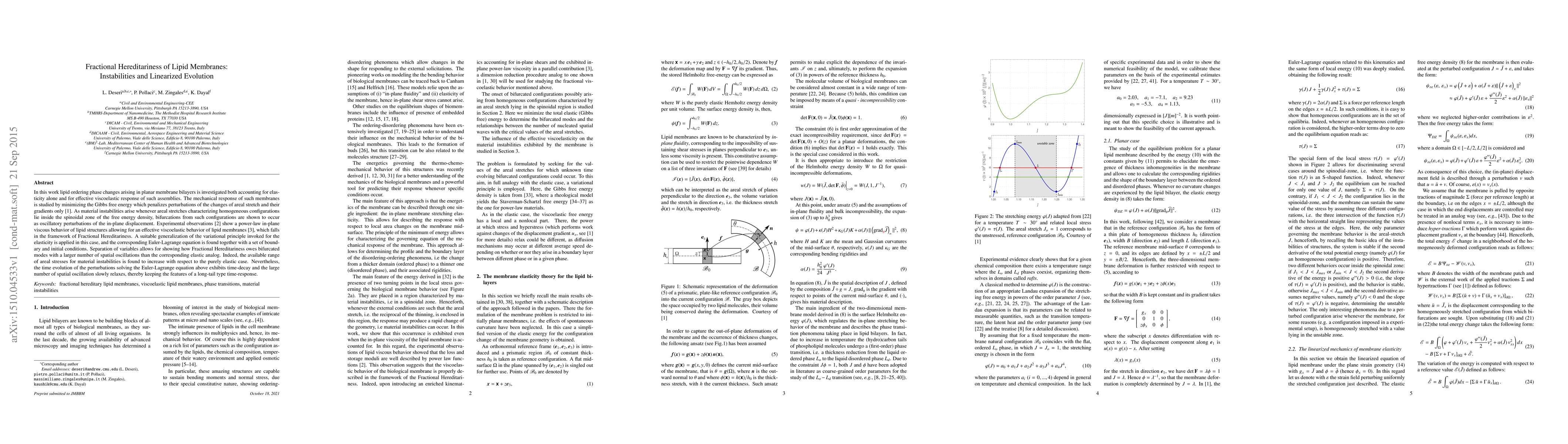 In this work lipid ordering phase changes arising in planar membrane bilayers is investigated both accounting for elas- ticity alone and for effective viscoelastic response of such assemblies. The mechanical response of such membranes is studied by minimizing the Gibbs free energy which penalizes perturbations of the changes of areal stretch and their gradients only [1]. As material instabilities arise whenever areal stretches characterizing homogeneous configurations lie inside the spinoidal zone of the free energy density, bifurcations from such configurations are shown to occur as oscillatory perturbations of the in-plane displacement. Experimental observations [2] show a power-law in-plane viscous behavior of lipid structures allowing for an effective viscoelastic behavior of lipid membranes [3], which falls in the framework of Fractional Hereditariness. A suitable generalization of the variational principle invoked for the elasticity is applied in this case, and the corresponding Euler-Lagrange equation is found together with a set of bound- ary and initial conditions. Separation of variables allows for showing how Fractional Hereditariness owes bifurcated modes with a larger number of spatial oscillations than the corresponding elastic analog. Indeed, the available range of areal stresses for material instabilities is found to increase with respect to the purely elastic case. Nevertheless, the time evolution of the perturbations solving the Euler-Lagrange equation above exhibits time-decay and the large number of spatial oscillation slowly relaxes, thereby keeping the features of a long-tail type time-response.