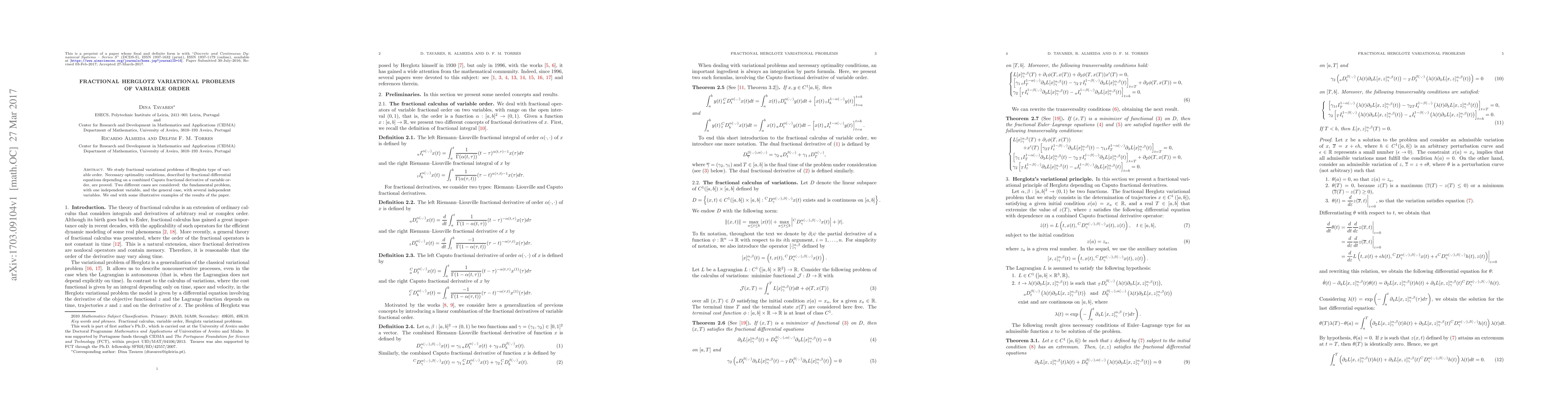 This paper investigates fractional Herglotz variational problems with variable order, deriving necessary optimality conditions via fractional differential equations involving a combined Caputo derivative of variable order. It considers both fundamental and general cases with one and multiple independent variables, respectively, and concludes with illustrative examples.