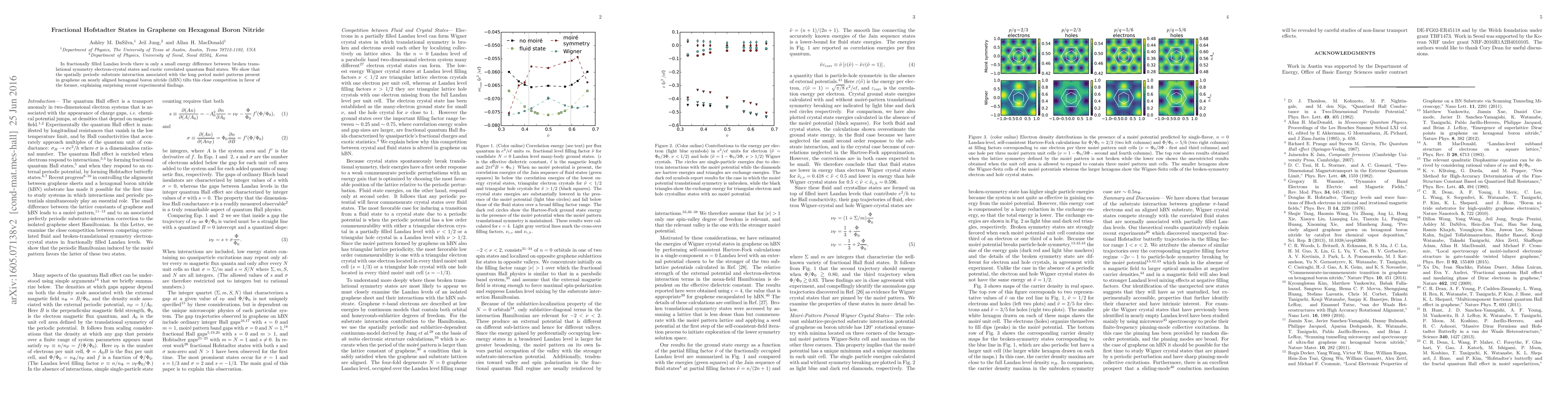 This paper demonstrates that the periodic substrate interaction in graphene on hexagonal boron nitride (hBN) favors electron-crystal states over exotic correlated quantum fluid states in fractionally filled Landau levels, explaining recent experimental observations. The moiré patterns in the system play a crucial role in this energy difference.