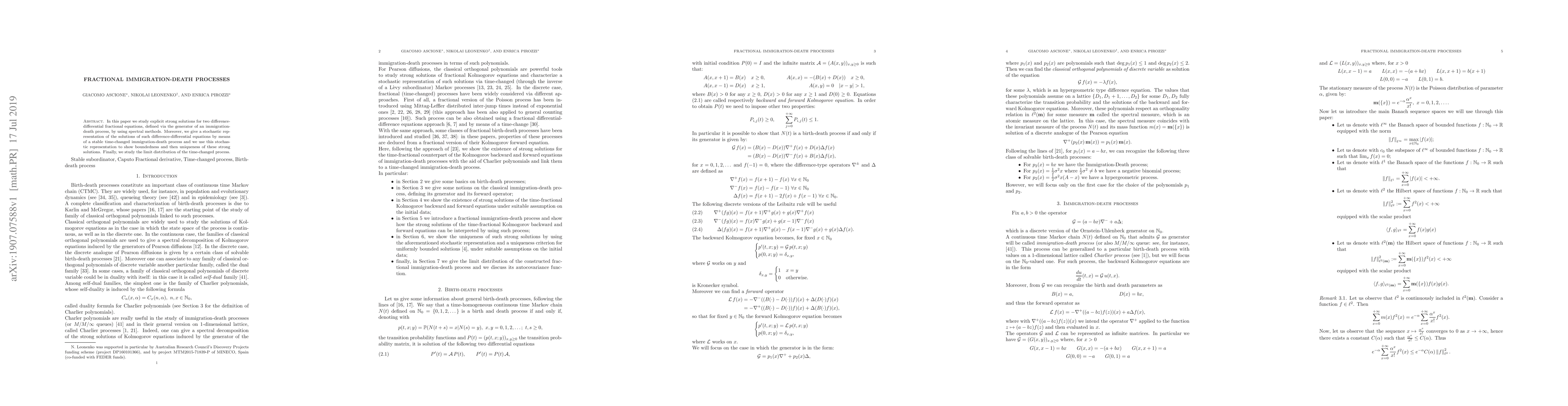 In this paper we study explicit strong solutions for two difference-differential fractional equations, defined via the generator of an immigration-death process, by using spectral methods. Moreover, we give a stochastic representation of the solutions of such difference-differential equations by means of a stable time-changed immigration-death process and we use this stochastic representation to show boundedness and then uniqueness of these strong solutions. Finally, we study the limit distribution of the time-changed process.