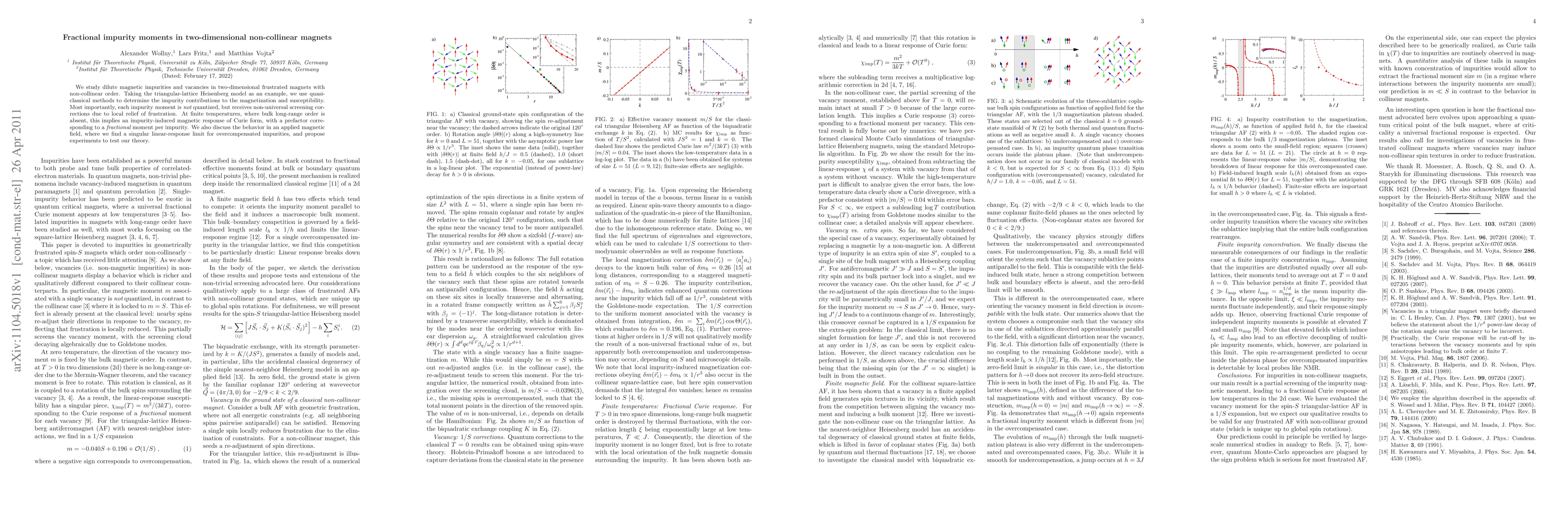 Researchers studied the effect of dilute magnetic impurities in two-dimensional frustrated magnets, finding non-quantized moments with screening corrections that lead to a Curie-like response at finite temperatures.