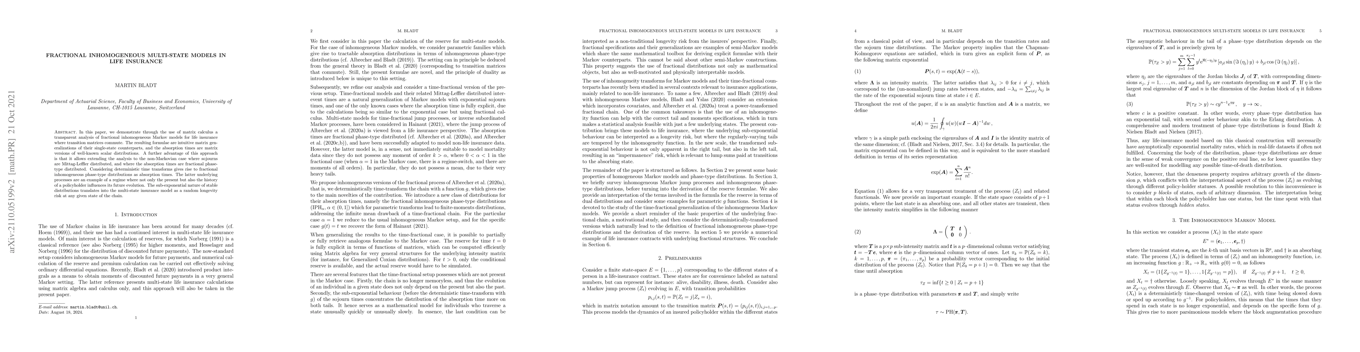 In this paper, we demonstrate through the use of matrix calculus a transparent analysis of fractional inhomogeneous Markov models for life insurance where transition matrices commute. The resulting formulae are intuitive matrix generalizations of their single-state counterparts, and the absorption times are matrix versions of well-known scalar distributions. A further advantage of this approach is that it allows extending the analysis to the non-Markovian case where sojourns are Mittag-Leffler distributed, and where the absorption times are fractional phase-type distributed. Considering deterministic time transforms gives rise to fractional inhomogeneous phase-type distributions as absorption times. The latter underlying processes are an example of a regime where not only the present but also the history of a policyholder influences its future evolution. The sub-exponential nature of stable distributions translates into the multi-state insurance model as a random longevity risk at any given state of the chain.