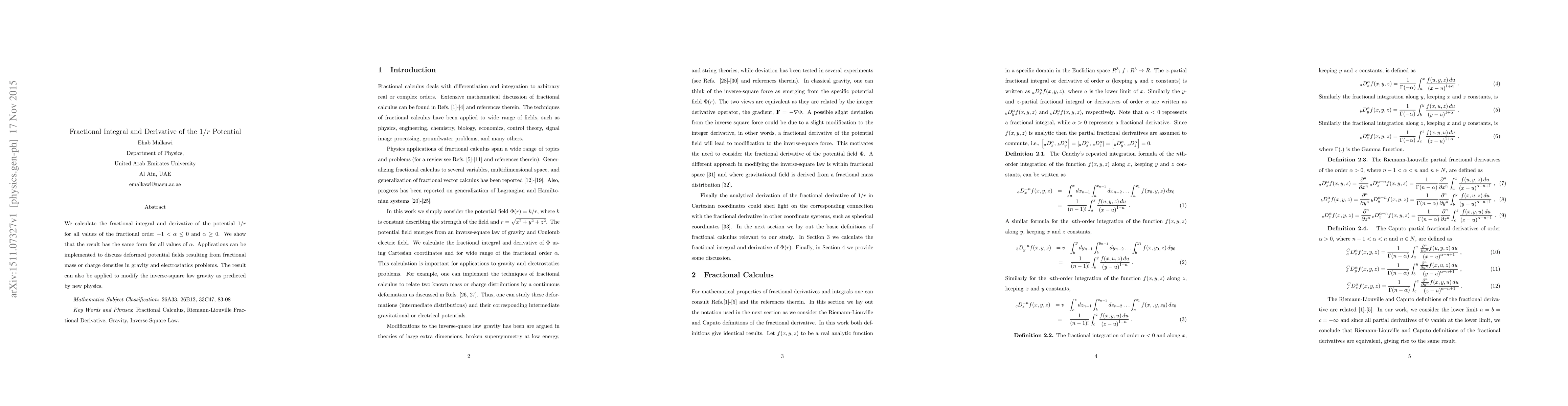 Researchers calculated the fractional integral and derivative of the 1/r potential for various values of a, showing that the result has the same form for all values of a. This can be applied to modify gravity models and discuss deformed potential fields.