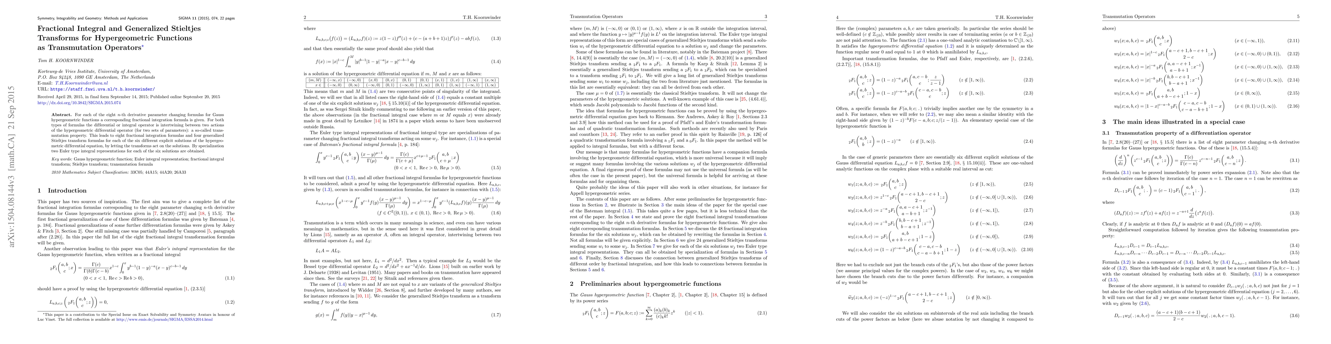 For each of the eight $n$-th derivative parameter changing formulas for Gauss hypergeometric functions a corresponding fractional integration formula is given. For both types of formulas the differential or integral operator is intertwining between two actions of the hypergeometric differential operator (for two sets of parameters): a so-called transmutation property. This leads to eight fractional integration formulas and four generalized Stieltjes transform formulas for each of the six different explicit solutions of the hypergeometric differential equation, by letting the transforms act on the solutions. By specialization two Euler type integral representations for each of the six solutions are obtained.