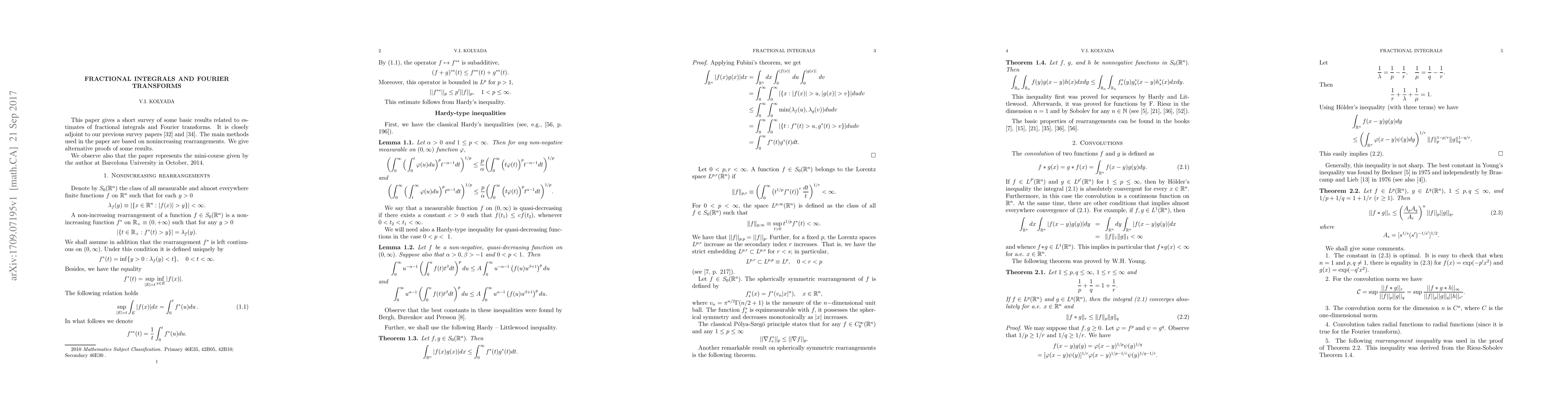 This paper surveys fundamental results on fractional integrals and Fourier transforms, employing nonincreasing rearrangements as primary methods and offering alternative proofs of some established results. The work is based on a mini-course given by the author at Barcelona University in October 2014.