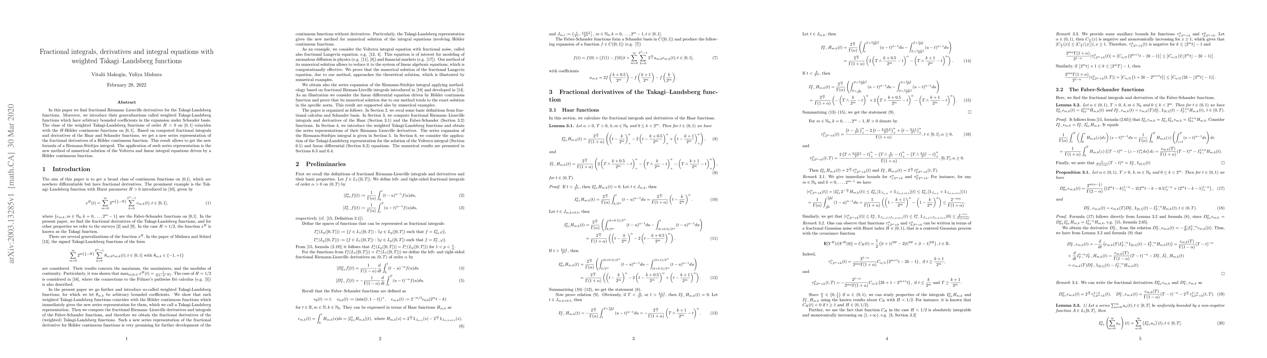 This paper develops fractional Riemann-Liouville derivatives for Takagi-Landsberg functions and introduces weighted versions with arbitrary bounded coefficients. It provides a new series representation for fractional derivatives of Hölder continuous functions, leading to a new formula for the Riemann-Stieltjes integral and a novel method for solving Volterra and linear integral equations.