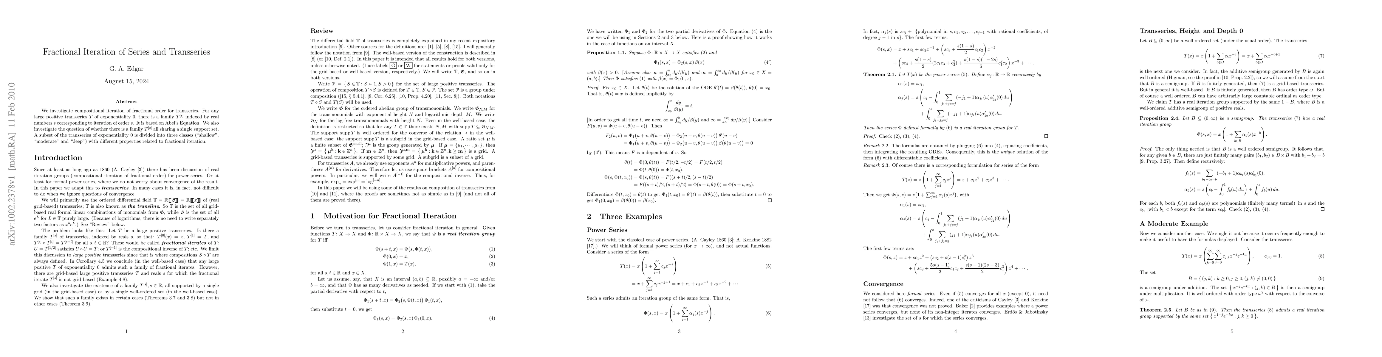 This paper explores the fractional iteration of transseries using Abel's Equation, constructing a family $T^{[s]}$ for each real number $s$. It examines whether these iterations share a single support set and categorizes transseries of exponentiality 0 into "shallow," "moderate," and "deep" classes based on their fractional iteration properties.