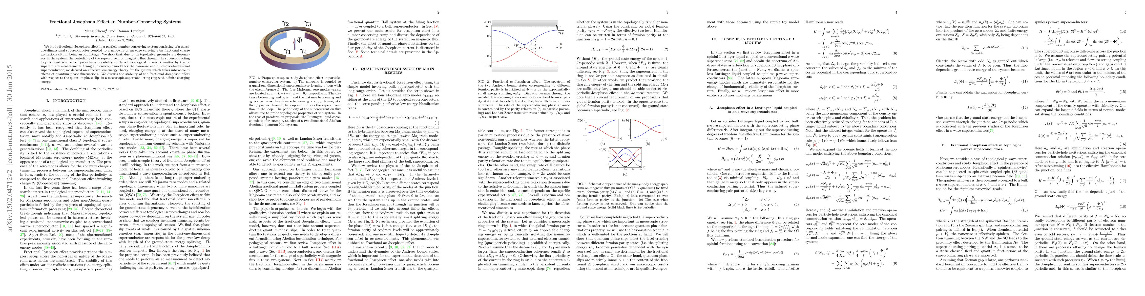 This paper investigates the fractional Josephson effect in a particle-number conserving system, where a quasi-one-dimensional superconductor is coupled to a nanowire with fractional charge excitations. The study reveals a non-trivial periodicity in the supercurrent due to topological ground-state degeneracy, enabling detection of topological phases via dc supercurrent measurements.