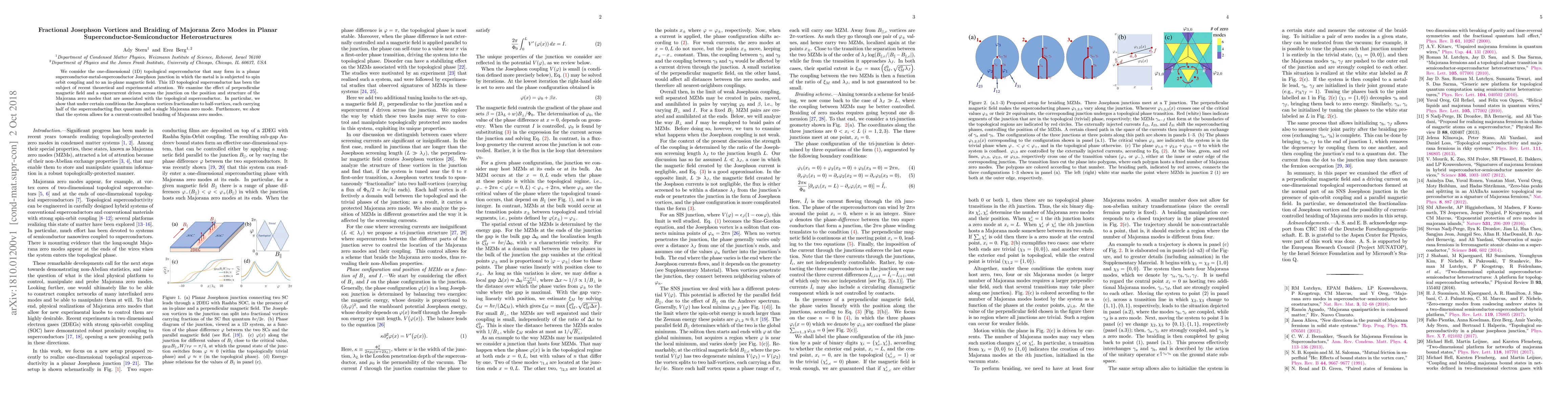 We consider the one-dimensional (1D) topological superconductor that may form in a planar superconductor-metal-superconductor Josephson junction in which the metal is is subjected to spin orbit coupling and to an in-plane magnetic field. This 1D topological superconductor has been the subject of recent theoretical and experimental attention. We examine the effect of perpendicular magnetic field and a supercurrent driven across the junction on the position and structure of the Majorana zero modes that are associated with the topological superconductor. In particular, we show that under certain conditions the Josephson vortices fractionalize to half-vortices, each carrying half of the superconducting flux quantum and a single Majorana zero mode. Furthemore, we show that the system allows for a current-controlled braiding of Majorana zero modes.
