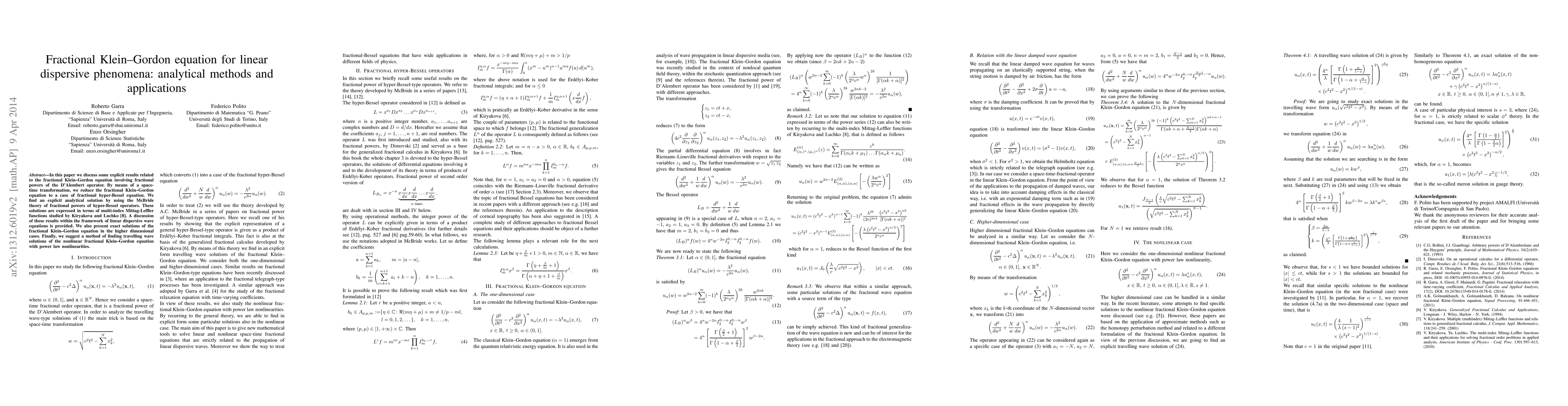 This paper presents exact analytical solutions for the fractional Klein-Gordon equation using McBride theory and space-time transformations, reducing it to a fractional hyper-Bessel-type equation. It discusses applications within linear dispersive wave phenomena and offers methods for finding travelling wave solutions of the nonlinear variant.