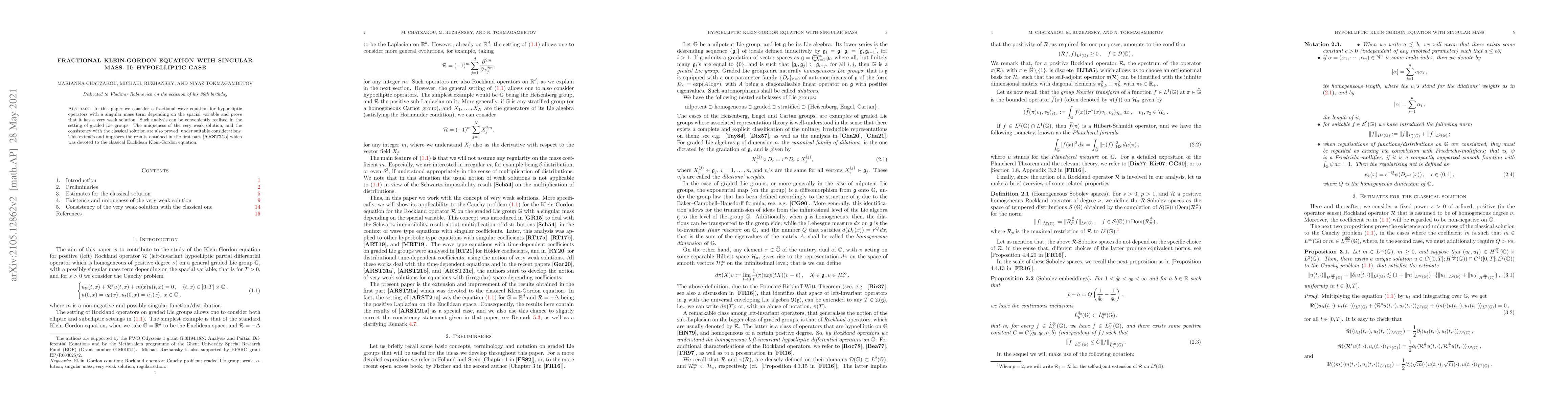 In this paper we consider a fractional wave equation for hypoelliptic operators with a singular mass term depending on the spacial variable and prove that it has a very weak solution. Such analysis can be conveniently realised in the setting of graded Lie groups. The uniqueness of the very weak solution, and the consistency with the classical solution are also proved, under suitable considerations. This extends and improves the results obtained in the first part of this work which was devoted to the classical Euclidean Klein-Gordon equation.