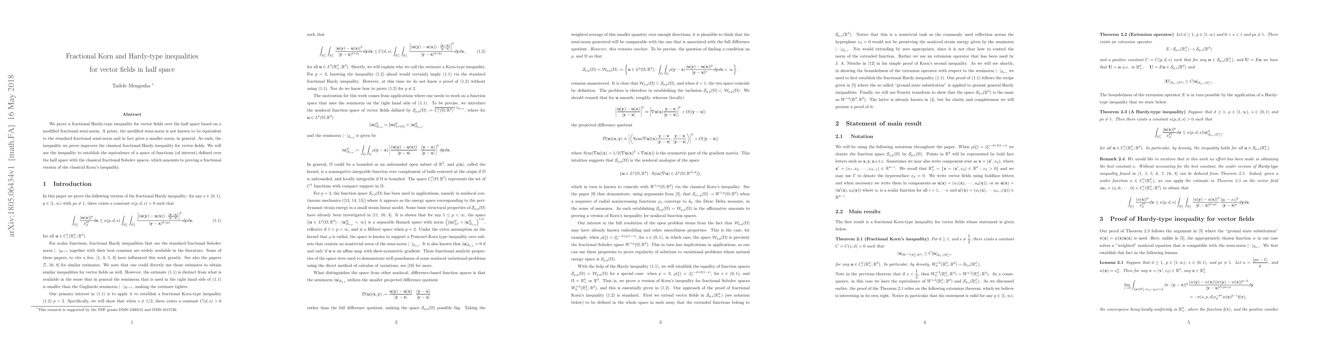 We prove a fractional Hardy-type inequality for vector fields over the half space based on a modified fractional semi-norm. A priori, the modified semi-norm is not known to be equivalent to the standard fractional semi-norm and in fact gives a smaller norm, in general. As such, the inequality we prove improves the classical fractional Hardy inequality for vector fields. We will use the inequality to establish the equivalence of a space of functions (of interest) defined over the half space with the classical fractional Sobolev spaces, which amounts to proving a fractional version of the classical Korn's inequality.