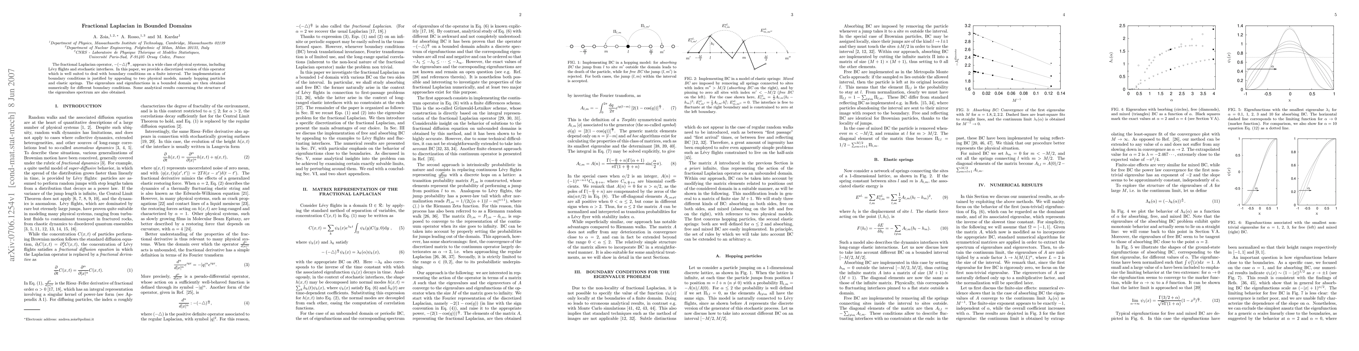 The fractional Laplacian operator, $-(-\triangle)^{\frac{\alpha}{2}}$, appears in a wide class of physical systems, including L\'evy flights and stochastic interfaces. In this paper, we provide a discretized version of this operator which is well suited to deal with boundary conditions on a finite interval. The implementation of boundary conditions is justified by appealing to two physical models, namely hopping particles and elastic springs. The eigenvalues and eigenfunctions in a bounded domain are then obtained numerically for different boundary conditions. Some analytical results concerning the structure of the eigenvalues spectrum are also obtained.