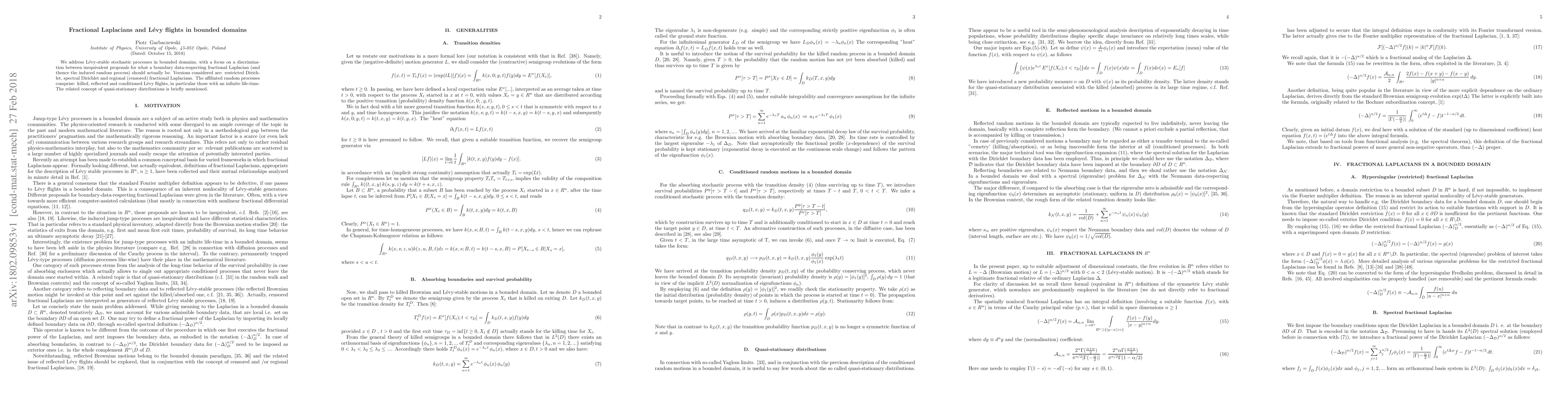 We address L\'{e}vy-stable stochastic processes in bounded domains, with a focus on a discrimination between inequivalent proposals for what a boundary data-respecting fractional Laplacian (and thence the induced random process) should actually be. Versions considered are: restricted Dirichlet, spectral Dirichlet and regional (censored) fractional Laplacians. The affiliated random processes comprise: killed, reflected and conditioned L\'{e}vy flights, in particular those with an infinite life-time. The related concept of quasi-stationary distributions is briefly mentioned.