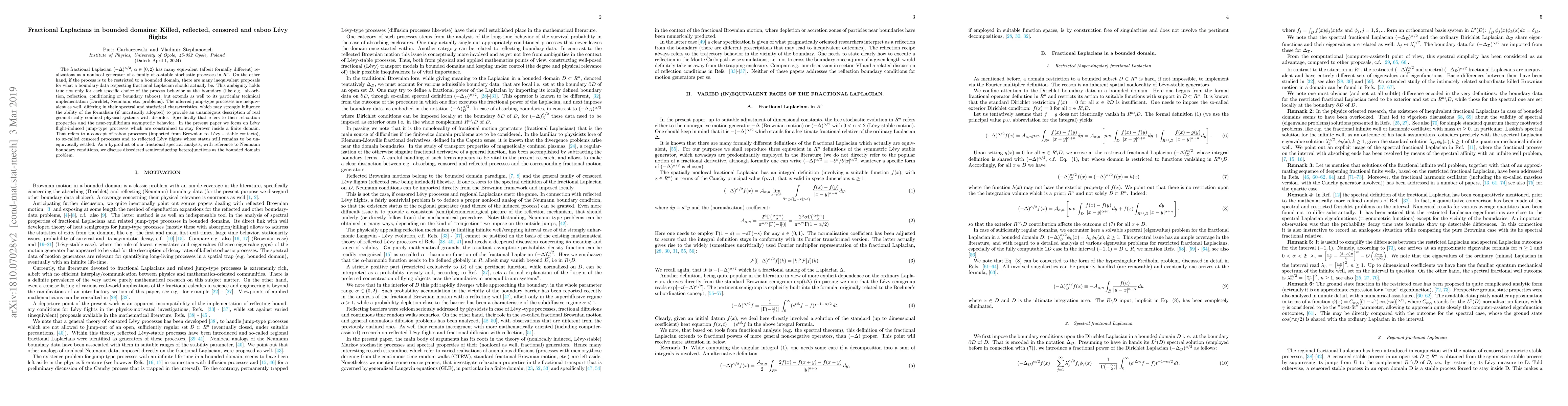 The fractional Laplacian $(- \Delta)^{\alpha /2}$, $\alpha \in (0,2)$ has many equivalent (albeit formally different) realizations as a nonlocal generator of a family of $\alpha $-stable stochastic processes in $R^n$. On the other hand, if the process is to be restricted to a bounded domain, there are many inequivalent proposals for what a boundary-data respecting fractional Laplacian should actually be. This ambiguity holds true not only for each specific choice of the process behavior at the boundary (like e.g. absorbtion, reflection, conditioning or boundary taboos), but extends as well to its particular technical implementation (Dirchlet, Neumann, etc. problems). The inferred jump-type processes are inequivalent as well, differing in their spectral and statistical characteristics. In the present paper we focus on L\'evy flight-induced jump-type processes which are constrained to stay forever inside a finite domain. That refers to a concept of taboo processes (imported from Brownian to L\'evy - stable contexts), to so-called censored processes and to reflected L\'evy flights whose status still remains to be settled on both physical and mathematical grounds. As a byproduct of our fractional spectral analysis, with reference to Neumann boundary conditions, we discuss disordered semiconducting heterojunctions as the bounded domain problem.