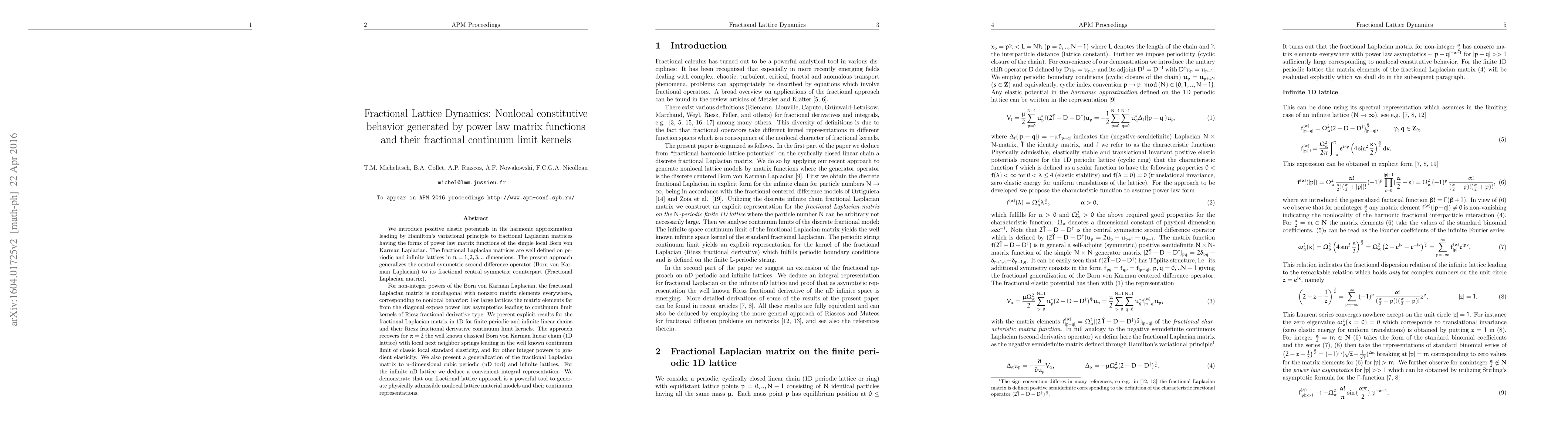 The introduction of fractional Laplacian matrices derived from power law matrix functions and their fractional continuum limit kernels, generalizing the Born-Karman Laplacian to nonlocal behavior.