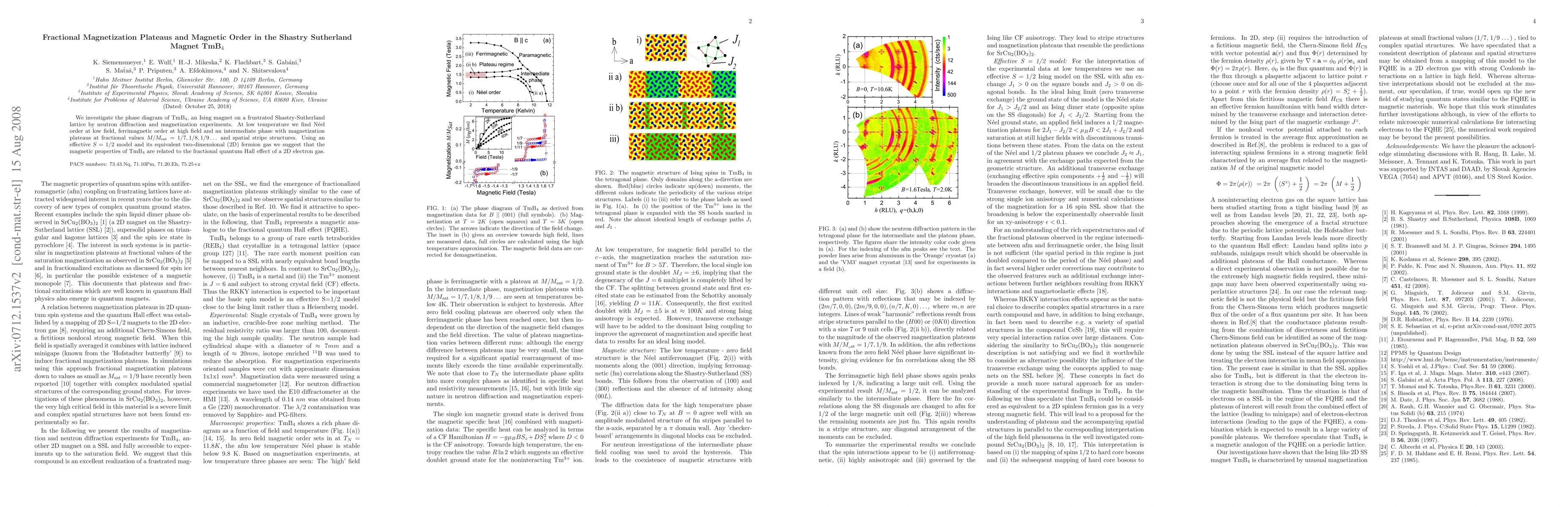 We investigate the phase diagram of TmB4, an Ising magnet on a frustrated Shastry-Sutherland lattice by neutron diffraction and magnetization experiments. At low temperature we find Neel order at low field, ferrimagnetic order at high field and an intermediate phase with magnetization plateaus at fractional values M/Msat = 1/7, 1/8, 1/9 ... and spatial stripe structures. Using an effective S = 1/2 model and its equivalent two-dimensional (2D) fermion gas we suggest that the magnetic properties of TmB4 are related to the fractional quantum Hall effect of a 2D electron gas.
