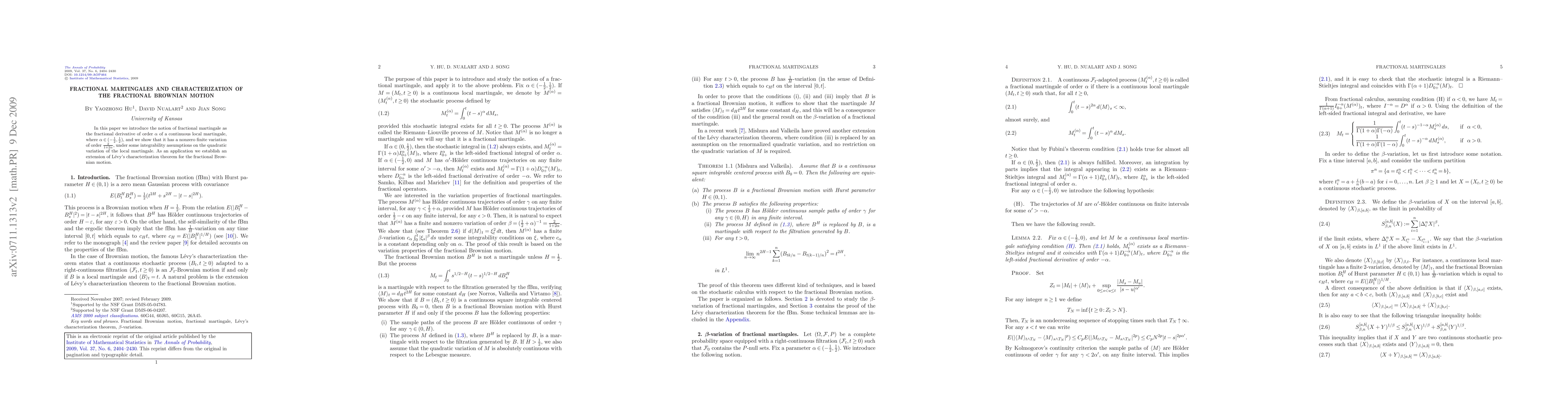 This paper introduces fractional martingales as fractional derivatives of continuous local martingales and proves their nonzero finite variation. It extends Lévy's characterization theorem to fractional Brownian motion, providing a new framework for understanding these processes.