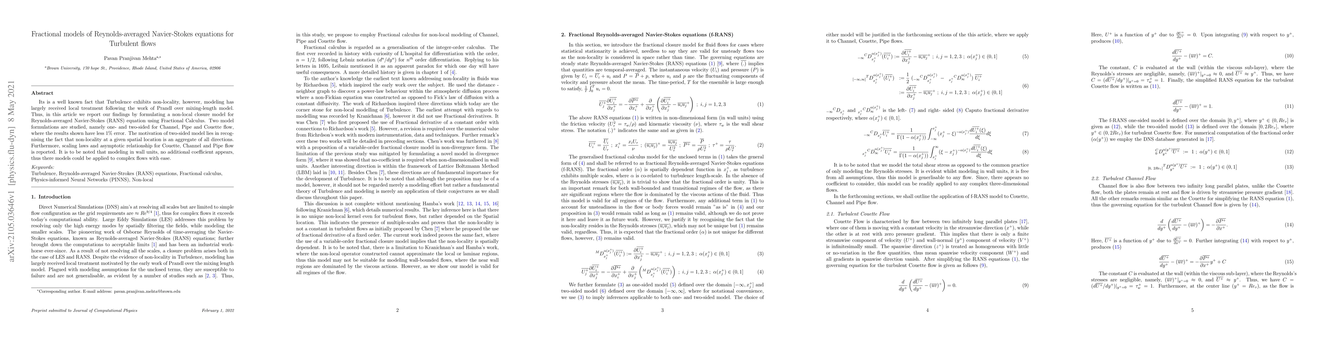 Its is a well known fact that Turbulence exhibits non-locality, however, modeling has largely received local treatment following the work of Prandl over mixing-length model. Thus, in this article we report our findings by formulating a non-local closure model for Reynolds-averaged Navier-Stokes (RANS) equation using Fractional Calculus. Two model formulations are studied, namely one- and two-sided for Channel, Pipe and Couette flow, where the results shown have less 1% error. The motivation of two-sided model lies in recognising the fact that non-locality at a given spatial location is an aggregate of all directions. Furthermore, scaling laws and asymptotic relationship for Couette, Channel and Pipe flow is reported. It is to be noted that modeling in wall units, no additional coefficient appears, thus there models could be applied to complex flows with ease.