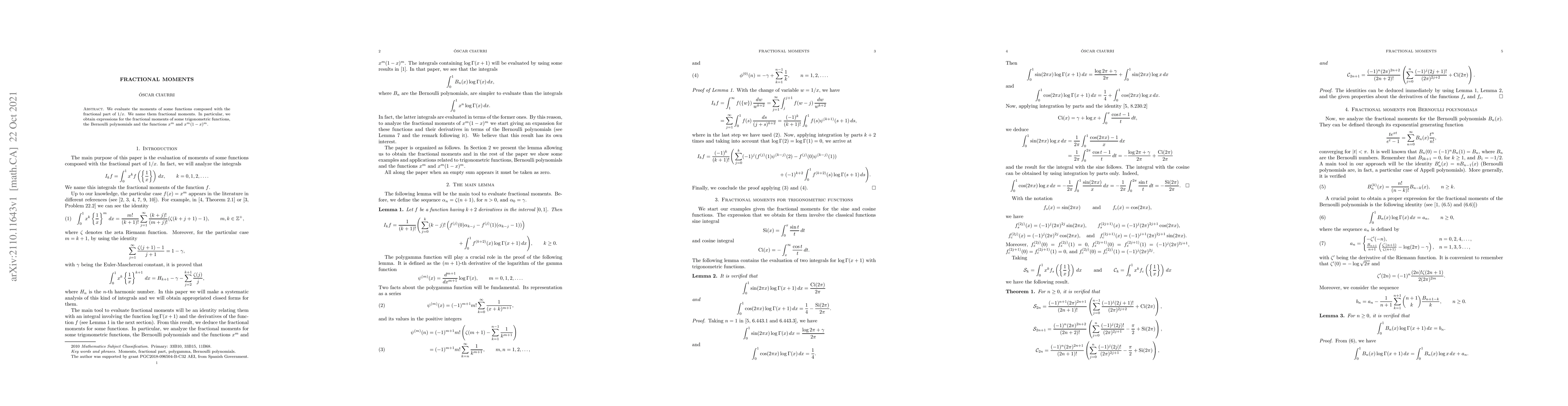 We evaluate the moments of some functions composed with the fractional part of $1/x$. We name them fractional moments. In particular, we obtain expressions for the fractional moments of some trigonometric functions, the Bernoulli polynomials and the functions $x^m$ and $x^m(1-x)^m$.