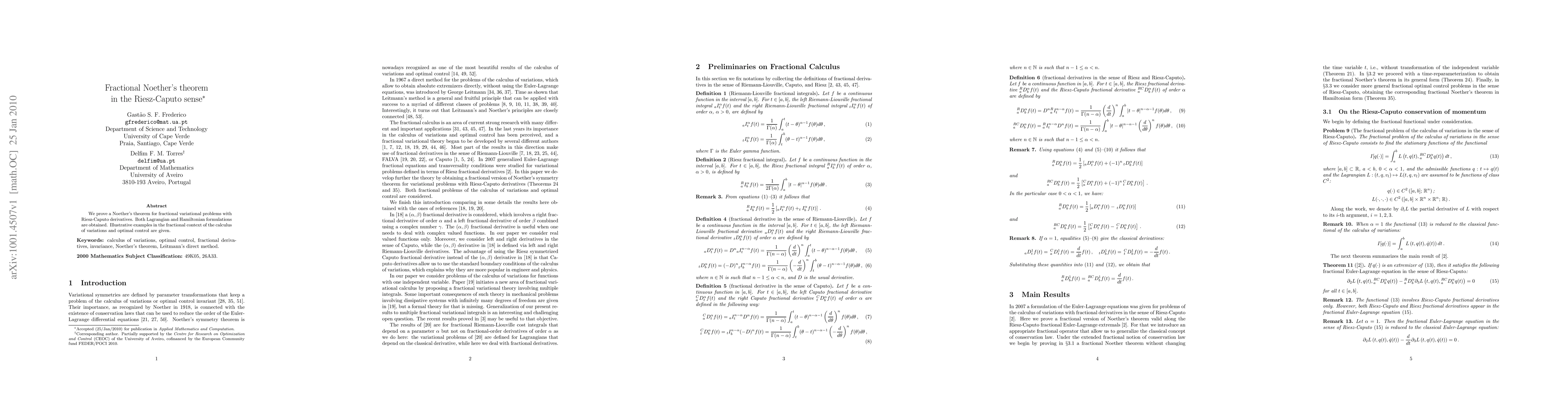 This paper proves a fractional version of Noether's theorem using Riesz-Caputo derivatives, establishing both Lagrangian and Hamiltonian formulations. It provides examples in fractional calculus of variations and optimal control to demonstrate the theorem's application.