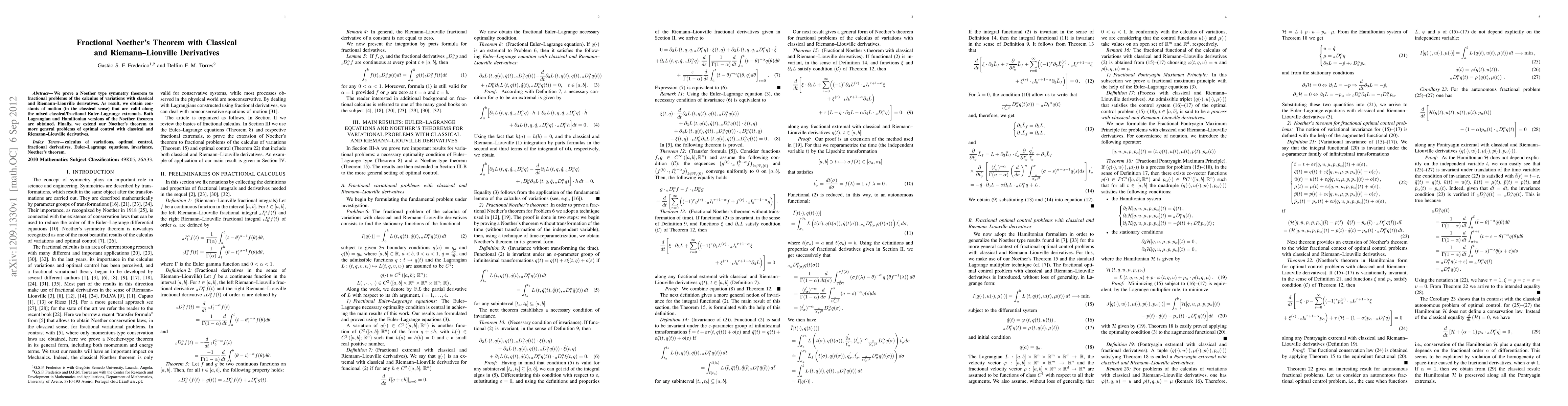 This paper establishes a fractional extension of Noether's theorem for calculus of variations involving both classical and Riemann-Liouville derivatives, leading to conserved quantities along mixed extremals. It also covers Lagrangian and Hamiltonian formulations and extends to optimal control problems.