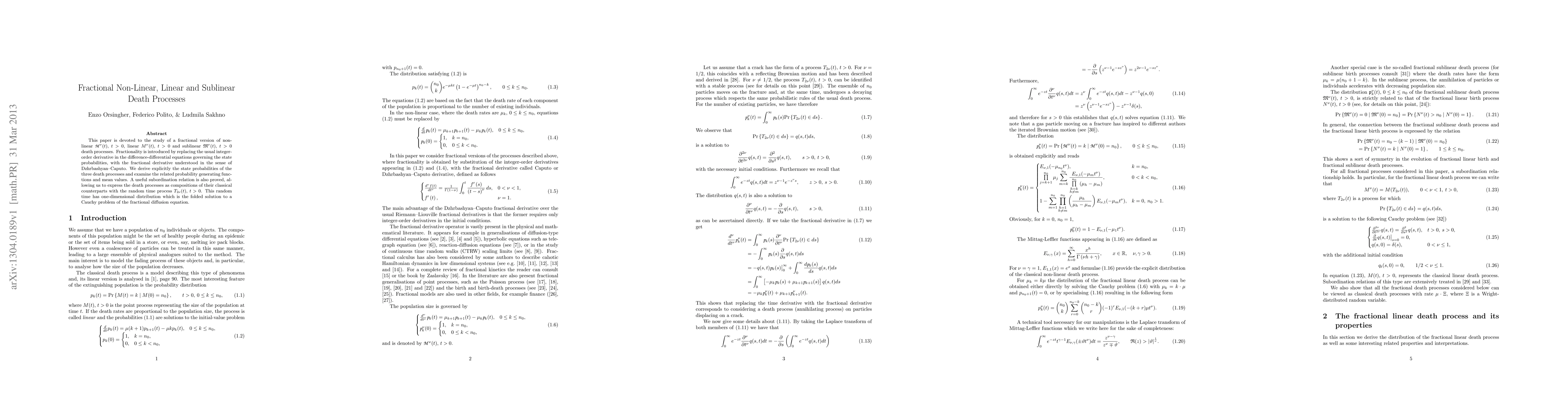 This paper is devoted to the study of a fractional version of non-linear $\mathpzc{M}^\nu(t)$, $t>0$, linear $M^\nu (t)$, $t>0$ and sublinear $\mathfrak{M}^\nu (t)$, $t>0$ death processes. Fractionality is introduced by replacing the usual integer-order derivative in the difference-differential equations governing the state probabilities, with the fractional derivative understood in the sense of Dzhrbashyan--Caputo. We derive explicitly the state probabilities of the three death processes and examine the related probability generating functions and mean values. A useful subordination relation is also proved, allowing us to express the death processes as compositions of their classical counterparts with the random time process $T_{2 \nu} (t)$, $t>0$. This random time has one-dimensional distribution which is the folded solution to a Cauchy problem of the fractional diffusion equation.