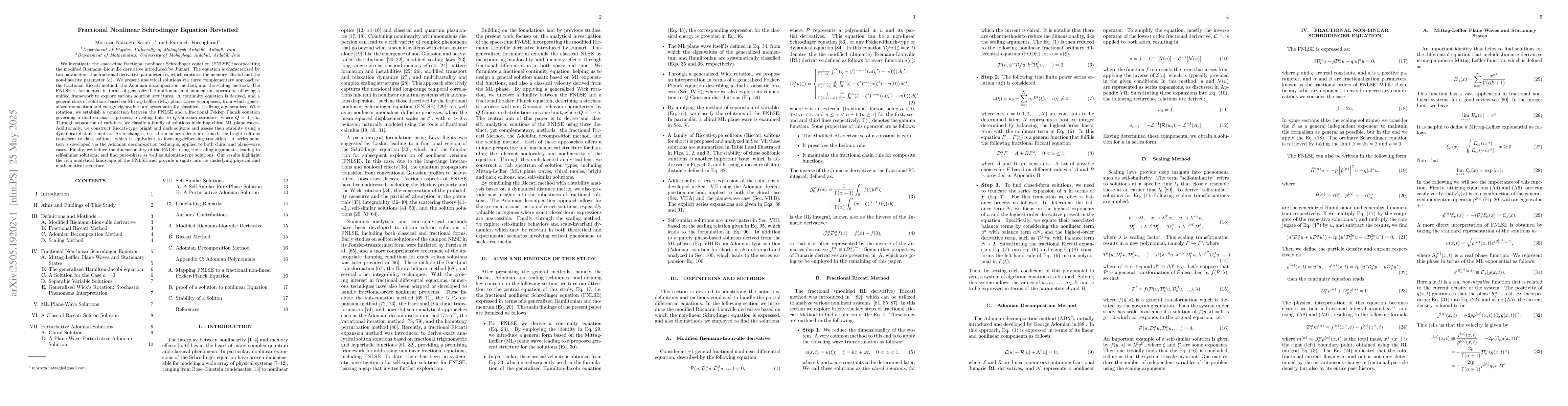 The research distinguishes itself by combining multiple analytical techniques, connecting FNLSE to stochastic processes, and classifying a wide range of solutions, offering a deeper understanding of fractional quantum systems.