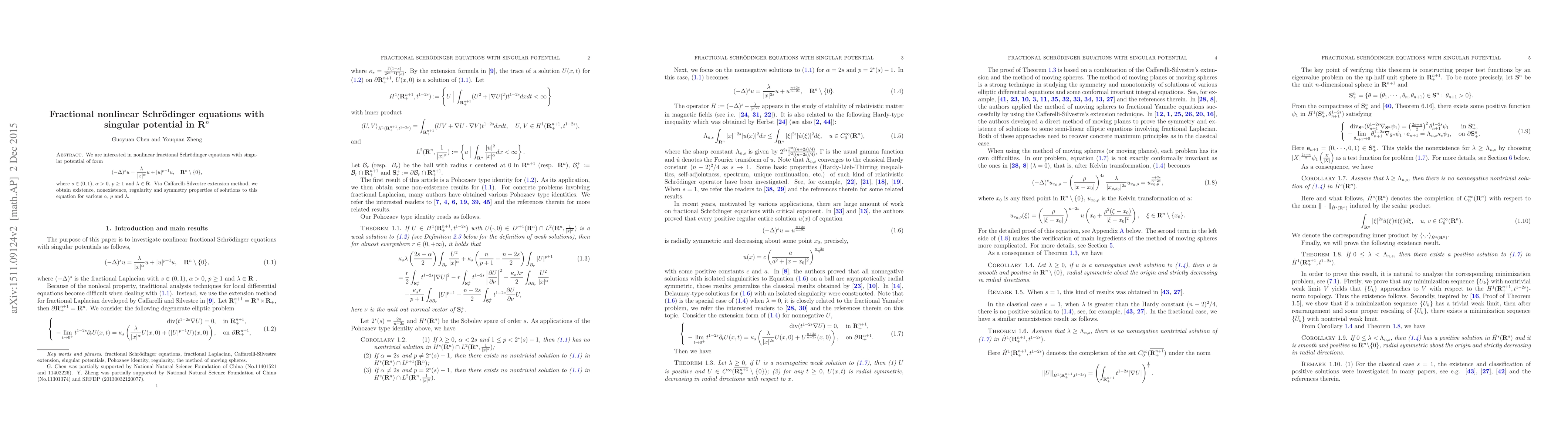 This paper investigates nonlinear fractional Schrödinger equations with singular potentials in $\mathbf R^n$. Using the Caffarelli-Silvestre extension method, it establishes existence, nonexistence, regularity, and symmetry properties of solutions for different parameters $\alpha$, $p$, and $\lambda$.