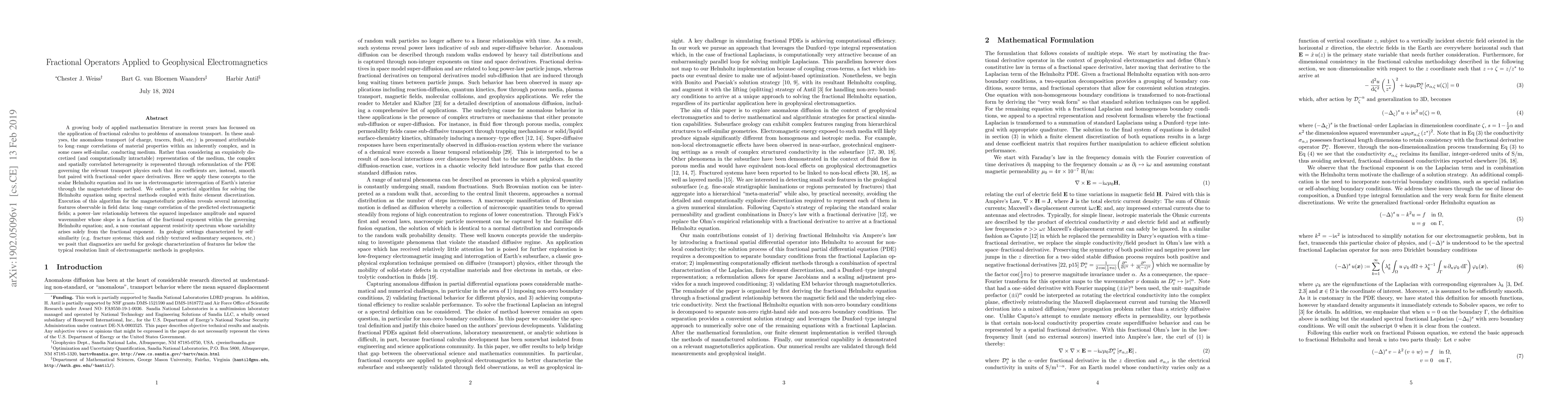 A growing body of applied mathematics literature in recent years has focussed on the application of fractional calculus to problems of anomalous transport. In these analyses, the anomalous transport (of charge, tracers, fluid, etc.) is presumed attributable to long-range correlations of material properties within an inherently complex, and in some cases self-similar, conducting medium. Rather than considering an exquisitely discretized (and computationally intractable) representation of the medium, the complex and spatially correlated heterogeneity is represented through reformulation of the PDE governing the relevant transport physics such that its coefficients are, instead, smooth but paired with fractional-order space derivatives. Here we apply these concepts to the scalar Helmholtz equation and its use in electromagnetic interrogation of Earth's interior through the magnetotelluric method. We outline a practical algorithm for solving the Helmholtz equation using spectral methods coupled with finite element discretization. Execution of this algorithm for the magnetotelluric problem reveals several interesting features observable in field data: long--range correlation of the predicted electromagnetic fields; a power-law relationship between the squared impedance amplitude and squared wavenumber whose slope is a function of the fractional exponent within the governing Helmholtz equation; and, a non-constant apparent resistivity spectrum whose variability arises solely from the fractional exponent. In geologic settings characterized by self--similarity (e.g. fracture systems; thick and richly-textured sedimentary sequences, etc.) we posit that diagnostics are useful for geologic characterization of features far below the typical resolution limit of electromagnetic methods in geophysics.