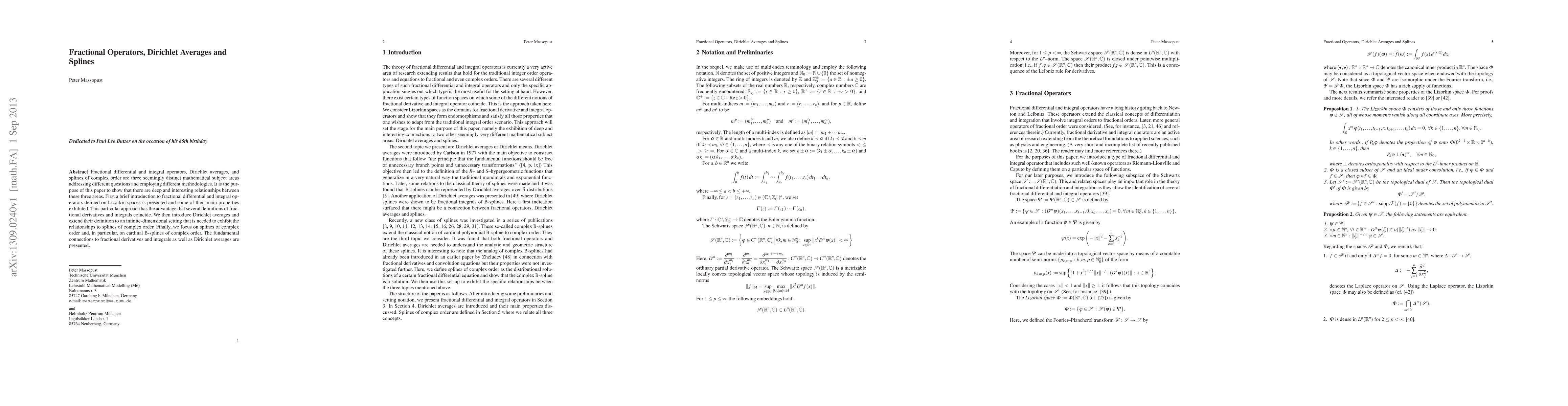 This paper explores the interconnectedness between fractional differential and integral operators, Dirichlet averages, and splines of complex order. It demonstrates how these distinct mathematical areas share deep and interesting relationships, particularly through the use of Lizorkin spaces and the extension of Dirichlet averages to infinite-dimensional settings.