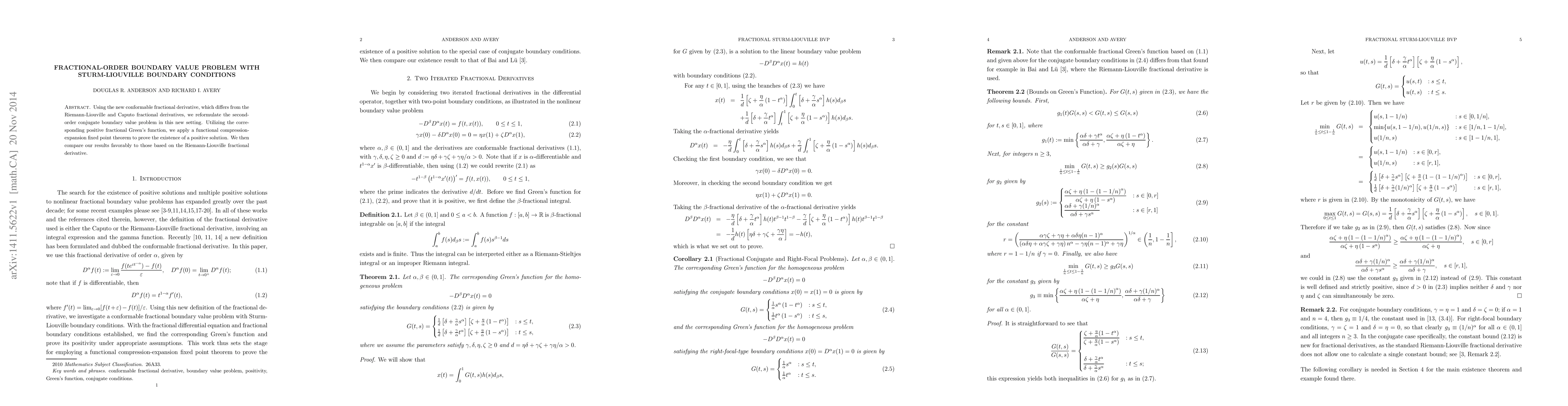 Using the new conformable fractional derivative, which differs from the Riemann-Liouville and Caputo fractional derivatives, we reformulate the second-order conjugate boundary value problem in this new setting. Utilizing the corresponding positive fractional Green's function, we apply a functional compression-expansion fixed point theorem to prove the existence of a positive solution. We then compare our results favorably to those based on the Riemann-Liouville fractional derivative.