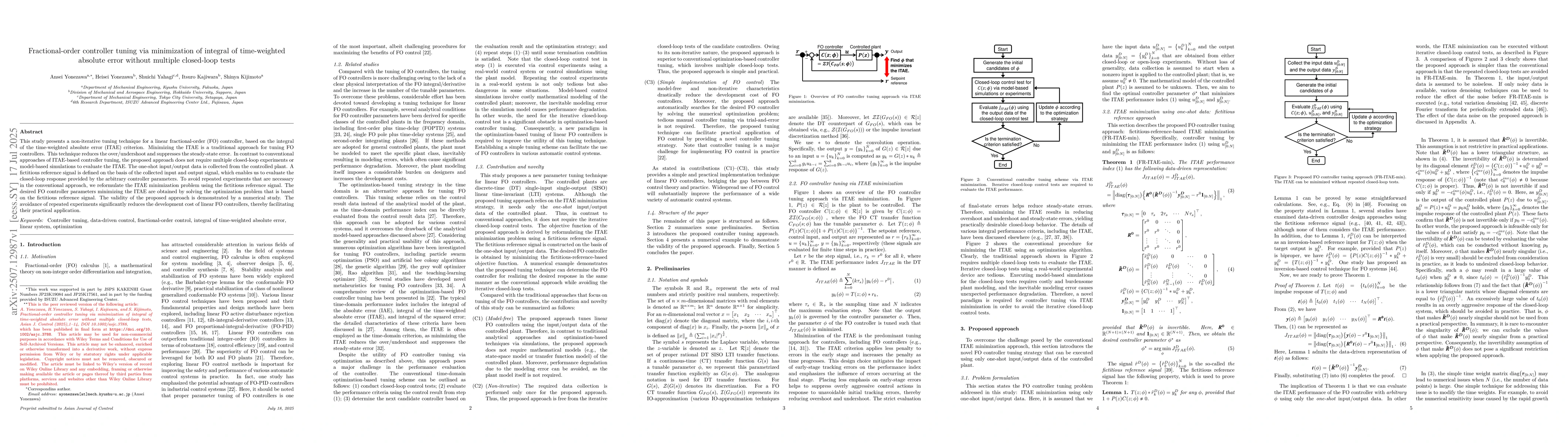 This study presents a non-iterative tuning technique for a linear fractional-order (FO) controller, based on the integral of the time-weighted absolute error (ITAE) criterion. Minimizing the ITAE is a traditional approach for tuning FO controllers. This technique reduces the over/undershoot and suppresses the steady-state error. In contrast to conventional approaches of ITAE-based controller tuning, the proposed approach does not require multiple closed-loop experiments or model-based simulations to evaluate the ITAE. The one-shot input/output data is collected from the controlled plant. A fictitious reference signal is defined on the basis of the collected input and output signal, which enables us to evaluate the closed-loop response provided by the arbitrary controller parameters. To avoid repeated experiments that are necessary in the conventional approach, we reformulate the ITAE minimization problem using the fictitious reference signal. The desired FO controller parameters minimizing the ITAE are obtained by solving the optimization problem that is based on the fictitious reference signal. The validity of the proposed approach is demonstrated by a numerical study. The avoidance of repeated experiments significantly reduces the development cost of linear FO controllers, thereby facilitating their practical application.