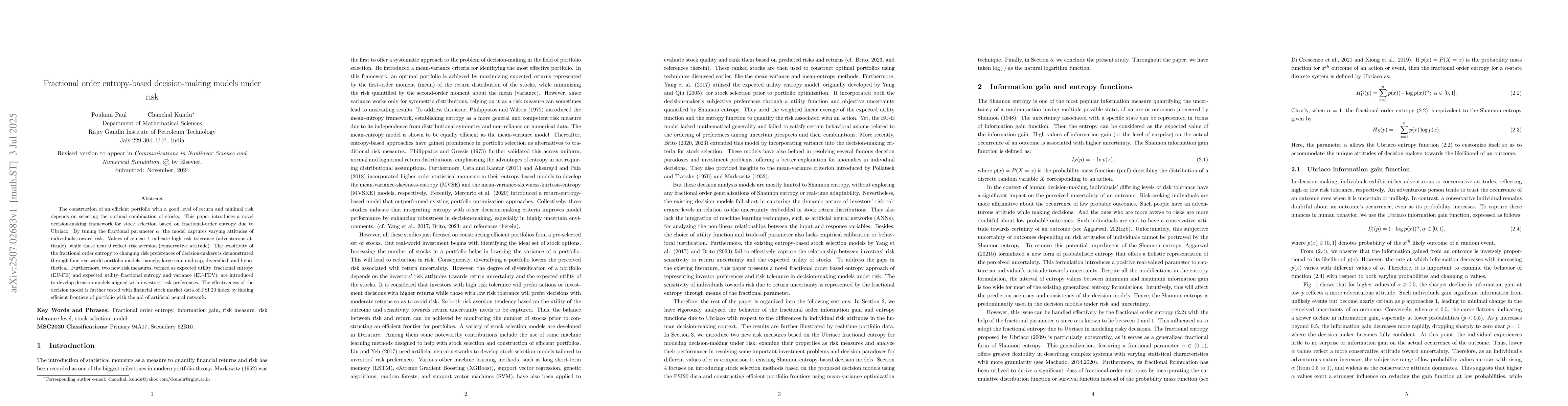 The construction of an efficient portfolio with a good level of return and minimal risk depends on selecting the optimal combination of stocks. This paper introduces a novel decision-making framework for stock selection based on fractional order entropy due to Ubriaco. By tuning the fractional parameter, the model captures varying attitudes of individuals toward risk. Values of fractional parameter near one indicate high risk tolerance (adventurous attitude), while those near zero reflect risk aversion (conservative attitude). The sensitivity of the fractional order entropy to changing risk preferences of decision makers is demonstrated through four real world portfolio models, namely, large cap, mid cap, diversified, and hypothetical. Furthermore, two new risk measures, termed as expected utility fractional entropy (EU FE) and expected utility fractional entropy and variance (EU FEV), are introduced to develop decision models aligned with investors risk preferences. The effectiveness of the decision model is further tested with financial stock market data of PSI index by finding efficient frontiers of portfolio with the aid of artificial neural network.