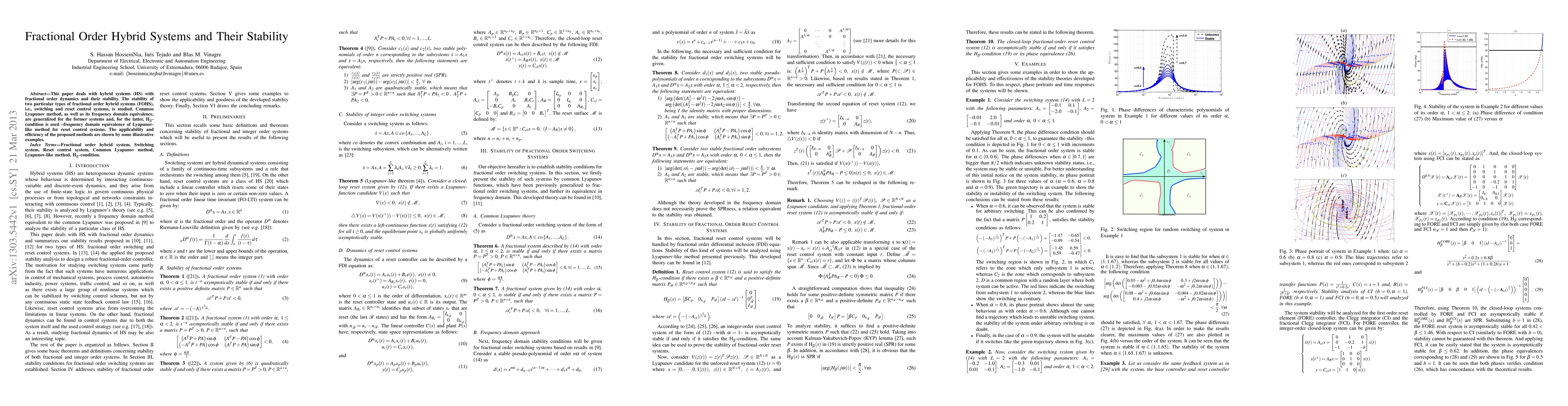This paper deals with hybrid systems (HS) with fractional order dynamics and their stability. The stability of two particular types of fractional order hybrid systems (FOHS), i.e., switching and reset control systems, is studied. Common Lyapunov method, as well as its frequency domain equivalence, are generalized for the former systems and, for the latter, H$_{\beta}$-condition is used --frequency domain equivalence of Lyapunov-like method for reset control systems. The applicability and efficiency of the proposed methods are shown by some illustrative examples.