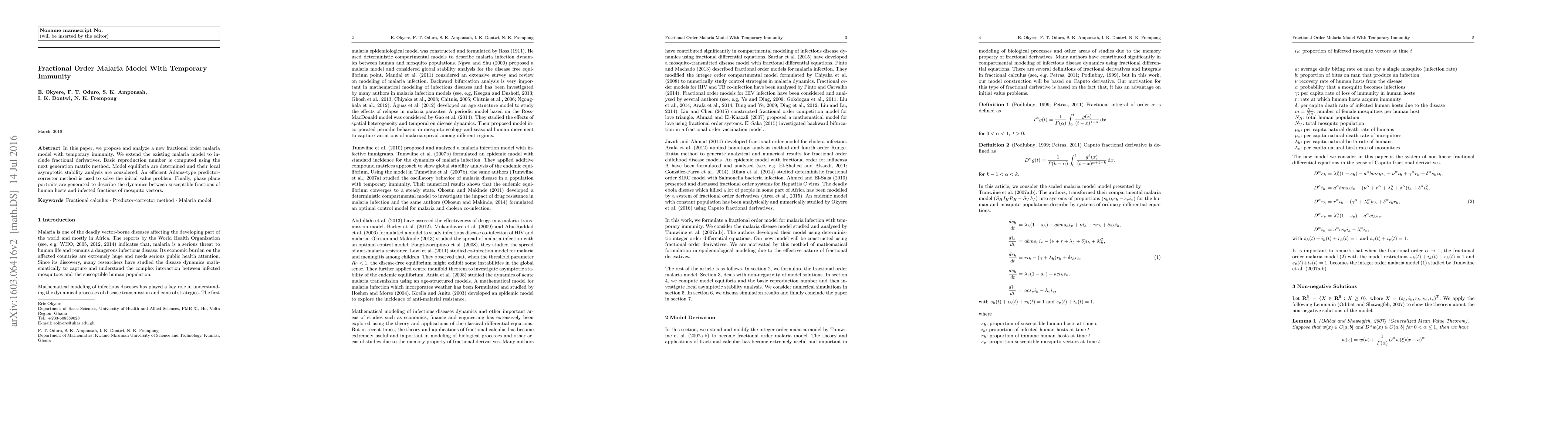 A new fractional order malaria model is proposed with temporary immunity, incorporating fractional derivatives to describe disease dynamics, and its equilibria and asymptotic stability are analyzed for insights into the spread of malaria.
