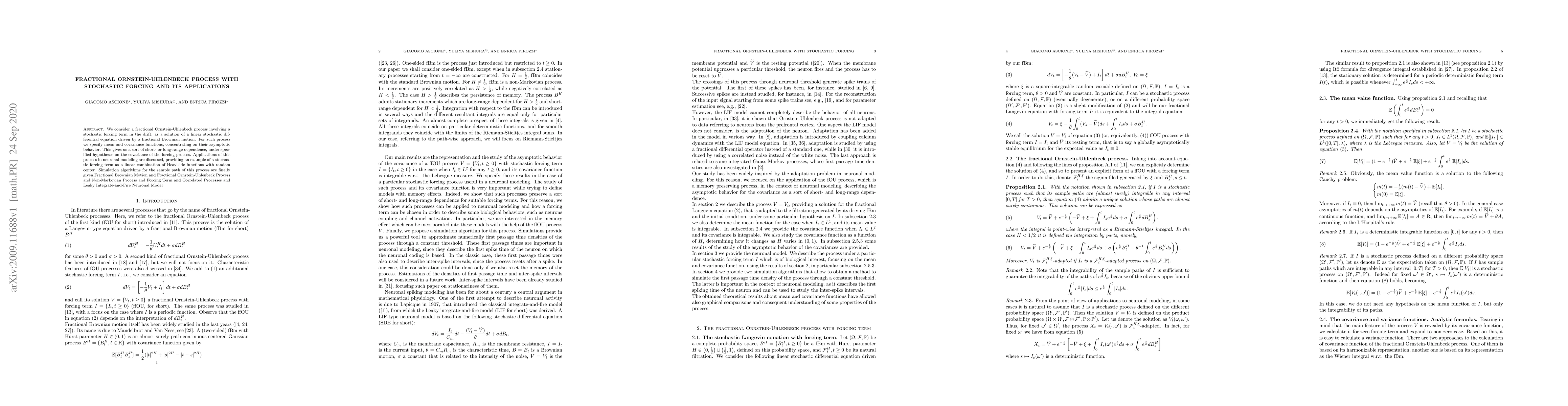 This paper studies a fractional Ornstein-Uhlenbeck process with stochastic forcing, deriving mean and covariance functions and discussing their asymptotic behavior. Applications in neuronal modeling and simulation algorithms for the process are also presented.
